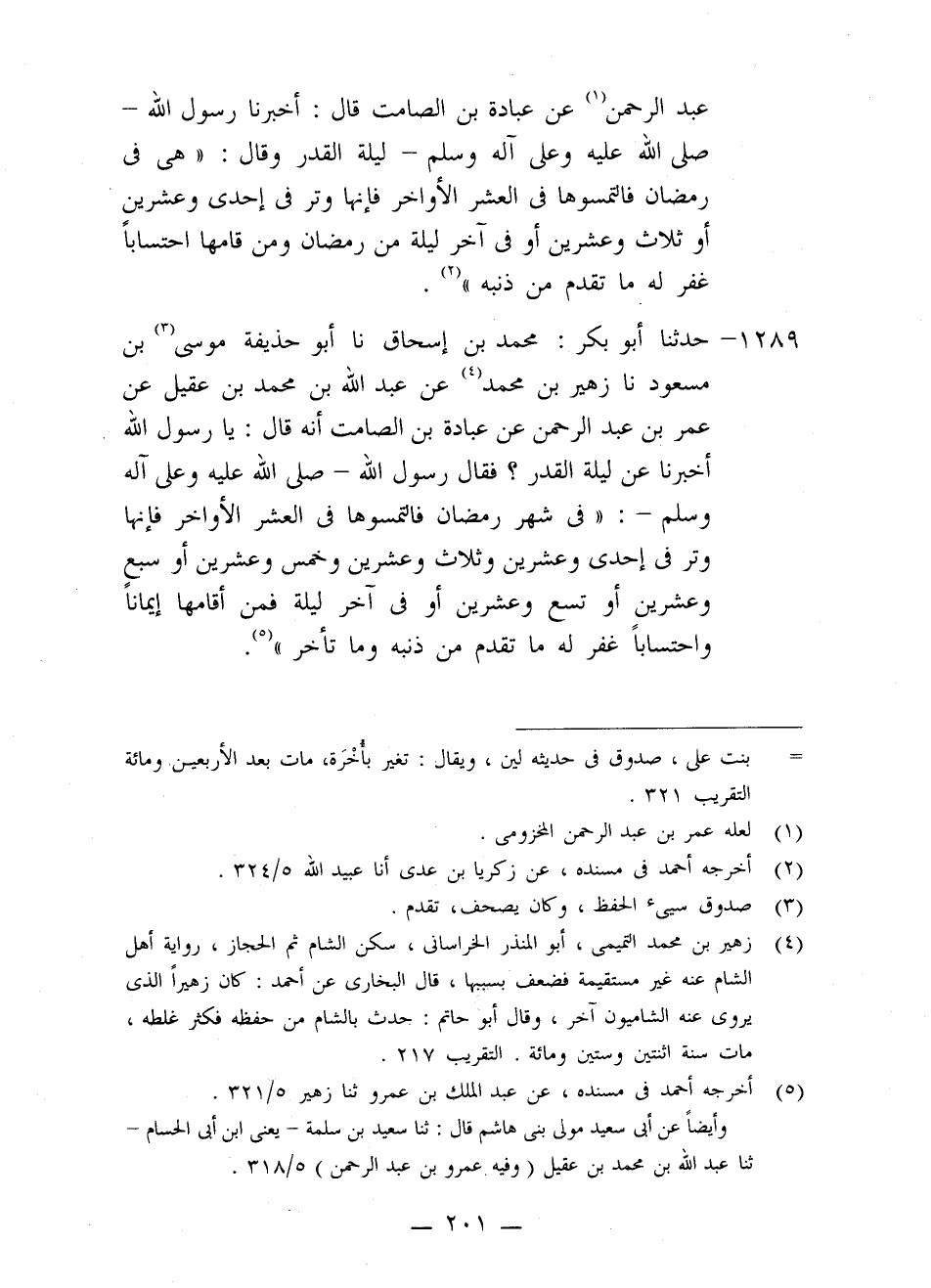 1289 - حَدَّثَنَا أَبُو بَكْرٍ مُحَمَّدُ بْنُ إِسْحَاقَ، نا أَبُو حُذَيْفَةَ مُوسَى بْنُ مَسْعُودٍ، نا زُهَيْرُ بْنُ مُحَمَّدٍ، عَنْ عَبْدِ اللَّهِ بْنِ مُحَمَّدِ بْنِ عَقِيلٍ، عَنْ عُمَرَ بْنِ عَبْدِ الرَّحْمَنِ، عَنْ عُبَادَةَ بْنِ الصَّامِتِ، أَنَّهُ قَالَ: يَا رَسُولَ اللَّهِ أَخْبِرْنَا عَنْ لَيْلَةِ الْقَدْرِ؟ فَقَالَ رَسُولُ اللَّهِ صَلَّى اللَّهُ عَلَيْهِ وَعَلَى آلِهِ وَسَلَّمَ: «فِي شَهْرِ رَمَضَانَ §فَالْتَمِسُوهَا فِي الْعَشْرِ الْأَوَاخِرِ فَإِنَّهَا وَتْرٌ فِي إِحْدَى وَعِشْرِينَ وثَلَاثٍ وَعِشْرِينَ وَخَمْسٍ وَعِشْرِينَ أَوْ سَبْعٍ وَعِشْرِينَ أَوْ تِسْعٍ وَعِشْرِينَ أَوْ فِي آخِرِ لَيْلَةٍ فَمَنْ أَقَامَهَا إِيمَانًا وَاحْتِسَابًا غُفِرَ لَهُ مَا تَقَدَّمَ مِنْ ذَنْبِهِ وَمَا تَأَخَّرَ»