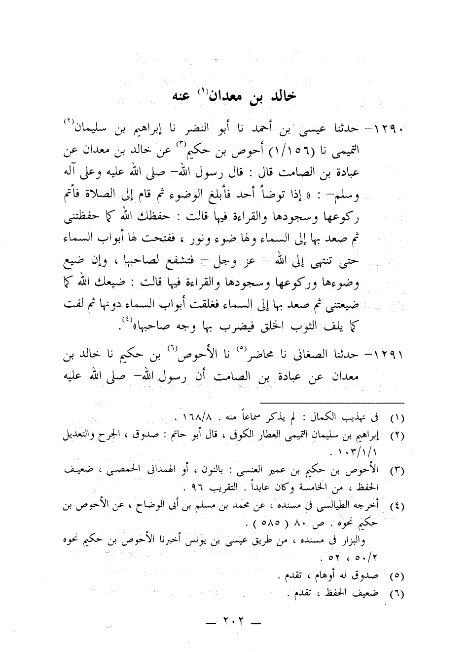 1291 - حَدَّثَنَا الصَّغَانِيُّ، نا مُحَاضِرُ، نا ابْنُ حَكِيمٍ، نا خَالِدُ بْنُ مَعْدَانَ، عَنْ عُبَادَةَ بْنِ الصَّامِتِ، أَنَّ رَسُولَ اللَّهِ صَلَّى اللَّهُ عَلَيْهِ وَعَلَى آلِهِ وَسَلَّمَ -[203]- كَانَ يَقُولُ: " §مَنْ تَوَضَّأَ فَأَحْسَنَ الْوُضُوءَ ثُمَّ قَامَ إِلَى الصَّلَاةِ، فَأَتَمَّ رُكُوعَهَا وَسُجُودَهَا وَالْقِرَاءَةَ فِيهَا قَالَتْ: حَفِظَكَ اللَّهُ كَمَا حَفِظْتَنِي، ثُمَّ صُعِدَ بِهَا إِلَى السَّمَاءِ وَلَهَا ضَوْءٌ وَنُورٌ، فَفُتِّحَتْ لَهَا أَبْوَابُ السَّمَاءِ حَتَّى تَنْتَهِيَ إِلَى اللَّهِ عَزَّ وَجَلَّ فَتَشْفَعَ لِصَاحِبِهَا، وَإِذَا ضَيَّعَ وُضُوءَهَا وَرُكُوعَهَا وَسُجُودَهَا وَالْقِرَاءَةَ فِيهَا قَالَتْ: ضَيَّعَكَ اللَّهُ كَمَا ضَيَّعْتَنِي، ثُمَّ صُعِدَ بِهَا إِلَى السَّمَاءِ وَعَلَيْهَا ظُلْمَةٌ فَغُلِّقَتْ أَبْوَابُ السَّمَاءِ دُونَهَا ثُمَّ لُفَّتْ كَمَا يُلَفُّ الثَّوْبُ الْخَلِقُ فَيُضْرَبُ بِهَا وَجْهُ صَاحِبِهَا "
