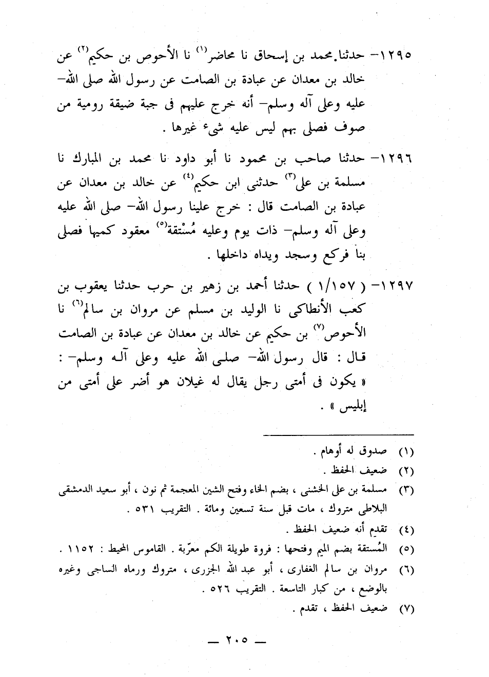 1297 - حَدَّثَنَا أَحْمَدُ بْنُ زُهَيْرِ بْنِ حَرْبٍ، حَدَّثَنَا يَعْقُوبُ بْنُ كَعْبٍ الْأَنْطَاكِيُّ، نا الْوَلِيدُ بْنُ مُسْلِمٍ، عَنْ مَرْوَانَ بْنِ سَالِمٍ، نا الْأَحْوَصُ بْنُ حَكِيمٍ، عَنْ خَالِدِ بْنِ مَعْدَانَ، عَنْ عُبَادَةَ بْنِ الصَّامِتِ، قَالَ: قَالَ رَسُولُ اللَّهِ صَلَّى اللَّهُ عَلَيْهِ وَعَلَى آلِهِ وَسَلَّمَ: «§يَكُونُ فِي أُمَّتِي رَجُلٌ يُقَالُ لَهُ غَيْلَانُ هُوَ أَضَرُّ عَلَى أُمَّتِي مِنْ إِبْلِيسَ»