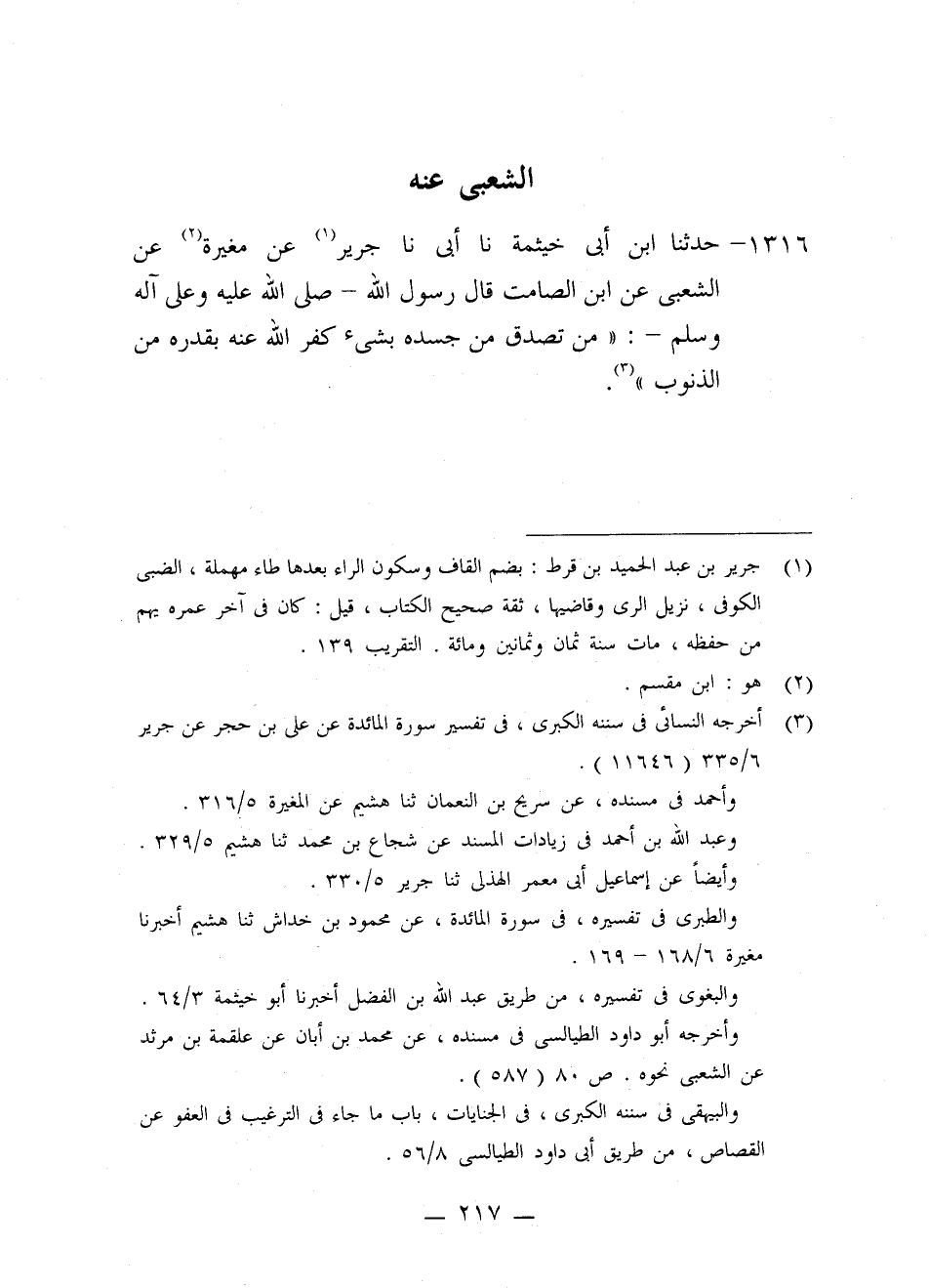 1316 - حَدَّثَنَا ابْنُ أَبِي خَيْثَمَةَ، نا أَبِي، نا جَرِيرُ، عَنْ مُغِيرَةَ، عَنِ الشَّعْبِيِّ، عَنِ ابْنِ الصَّامِتِ، قَالَ رَسُولُ اللَّهِ صَلَّى اللَّهُ عَلَيْهِ وَعَلَى آلِهِ وَسَلَّمَ: «§مَنْ تَصَدَّقَ مِنْ جَسَدِهِ بِشَيْءٍ كَفَّرَ اللَّهُ عَنْهُ بِقَدْرِهِ مِنَ الذُّنُوبِ»