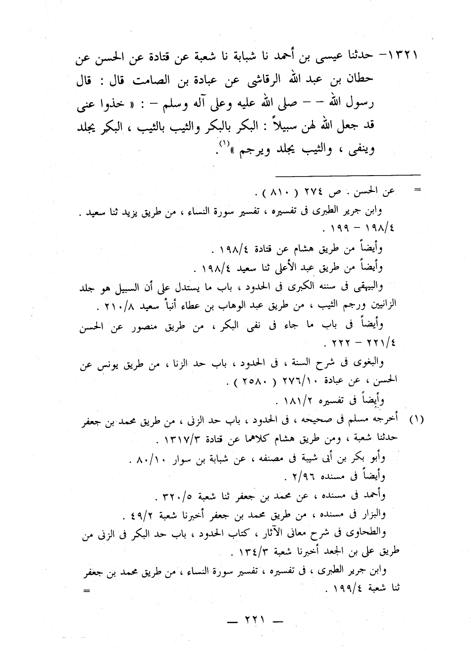 1321 - حَدَّثَنَا عِيسَى بْنُ أَحْمَدَ، نا شَبَابَةُ، نا شُعْبَةُ، عَنْ قَتَادَةَ، عَنِ الْحَسَنِ، عَنْ حِطَّانَ بْنِ عَبْدِ اللَّهِ الرَّقَاشِيِّ، عَنْ عُبَادَةَ بْنِ الصَّامِتِ، قَالَ: قَالَ رَسُولُ اللَّهِ صَلَّى اللَّهُ عَلَيْهِ وَعَلَى آلِهِ وَسَلَّمَ: " خُذُوا عَنِّي، قَدْ جَعَلَ اللَّهُ لَهُنَّ سَبِيلًا: §الْبِكْرُ بِالْبِكْرِ، وَالثَّيِّبُ بِالثَّيِّبِ، وَالْبِكْرُ يُجْلَدُ وَيُنْفَى، وَالثَّيِّبُ يُجْلَدُ وَيُرْجَمُ "