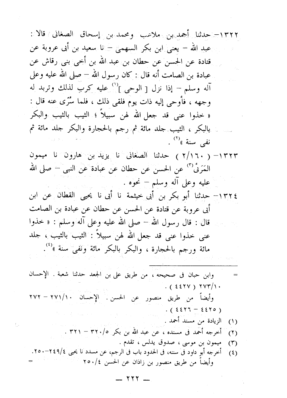 1322 - حَدَّثَنَا أَحْمَدُ بْنُ مُلَاعِبٍ، وَمُحَمَّدُ بْنُ إِسْحَاقَ الصَّغَانِيُّ، قَالَا: عَبْدُ اللَّهِ يَعْنِي ابْنَ بَكْرٍ السَّهْمِيَّ، نا سَعِيدُ بْنُ أَبِي عَرُوبَةَ، عَنْ قَتَادَةَ، عَنِ الْحَسَنِ، عَنْ حِطَّانَ بْنِ عَبْدِ اللَّهِ ابْنِ أَخِي بَنِي رَقَاشٍ، عَنْ عُبَادَةَ بْنِ الصَّامِتِ، أَنَّهُ قَالَ: كَانَ رَسُولُ اللَّهِ صَلَّى اللَّهُ عَلَيْهِ وَعَلَى آلِهِ وَسَلَّمَ إِذَا نَزَلَ الْوَحْيُ عَلَيْهِ كَرَبَ لِذَلِكَ وَتَرَبَّدَ لَهُ وَجْهُهُ، فَأُوحِيَ إِلَيْهِ ذَاتَ يَوْمٍ فَلَقِيَ ذَلِكَ، فَلَمَّا سُرِّيَ عَنْهُ قَالَ: «خُذُوا عَنِّي قَدْ جَعَلَ اللَّهُ لَهُنَّ سَبِيلًا؛ §الثَّيِّبُ بِالثَّيِّبِ، وَالْبِكْرُ بِالْبِكْرِ، الثَّيِّبُ جَلْدُ مِائَةٍ ثُمَّ رَجْمٌ بِالْحِجَارَةِ، وَالْبِكْرُ جَلْدُ مِائَةٍ ثُمَّ نَفْيُ سَنَةٍ» .