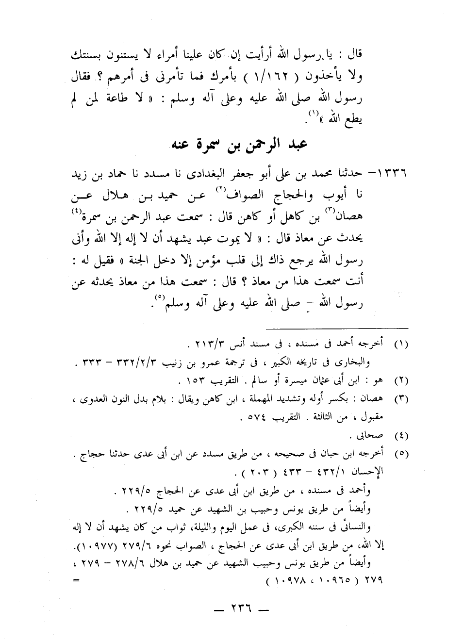 1336 - حَدَّثَنَا مُحَمَّدُ بْنُ عَلِيٍّ أَبُو جَعْفَرٍ الْبَغْدَادِيُّ، نا مُسَدَّدٌ، نا حَمَّادُ بْنُ زَيْدٍ، نا أَيُّوبُ، وَالْحَجَّاجُ الصَّوَّافُ، عَنْ حُمَيْدِ بْنِ هِلَالٍ، عَنْ هَصَّانَ بْنِ كَاهِلٍ أَوْ كَاهِنٍ قَالَ: سَمِعْتُ عَبْدَ الرَّحْمَنِ بْنِ سَمُرَةَ، يُحَدِّثُ عَنْ مُعَاذٍ، قَالَ: «§لَا يَمُوتُ عَبْدٌ يَشْهَدُ أَنْ لَا إِلَهَ إِلَّا اللَّهُ وَأَنِّي رَسُولُ اللَّهِ يَرْجِعُ ذَاكَ إِلَى قَلْبٍ مُؤْمِنٍ إِلَّا دَخَلَ الْجَنَّةَ» فَقِيلَ لَهُ: أَنْتَ سَمِعْتَ هَذَا مِنْ مُعَاذٍ؟ قَالَ: سَمِعْتُ هَذَا مِنْ مُعَاذٍ يُحَدِّثُهُ عَنْ رَسُولِ اللَّهِ صَلَّى اللَّهُ عَلَيْهِ وَعَلَى آلِهِ وَسَلَّمَ