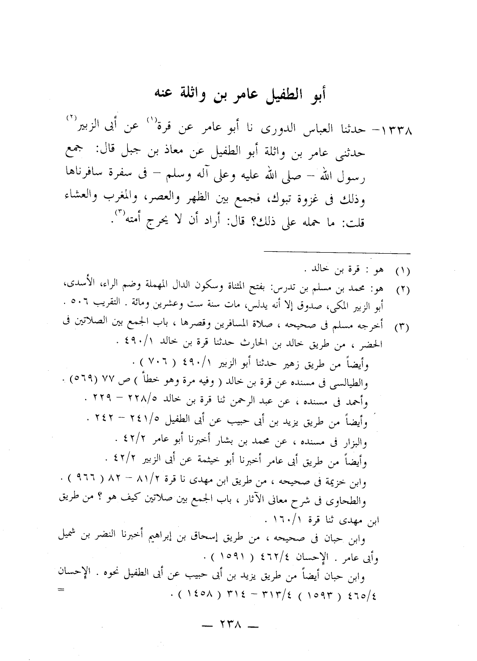 1338 - حَدَّثَنَا الْعَبَّاسُ الدُّورِيُّ، نا أَبُو عَامِرٍ، عَنْ قُرَّةَ، عَنْ أَبِي الزُّبَيْرِ، حَدَّثَنِي عَامِرُ بْنُ وَاثِلَةَ أَبُو الطُّفَيْلِ، عَنْ مُعَاذِ بْنِ جَبَلٍ، قَالَ: §جَمَعَ رَسُولُ اللَّهِ صَلَّى اللَّهُ عَلَيْهِ وَعَلَى آلِهِ وَسَلَّمَ فِي سَفْرَةٍ سَافَرْنَاهَا وَذَلِكَ فِي غَزْوَةِ تَبُوكَ، فَجَمَعَ بَيْنَ الظُّهْرِ وَالْعَصْرِ، وَالْمَغْرِبِ وَالْعِشَاءِ، قُلْتُ: مَا حَمَلَهُ عَلَى ذَلِكَ؟ قَالَ: أَرَادَ أَنْ لَا يُحْرِجَ أُمَّتَهُ