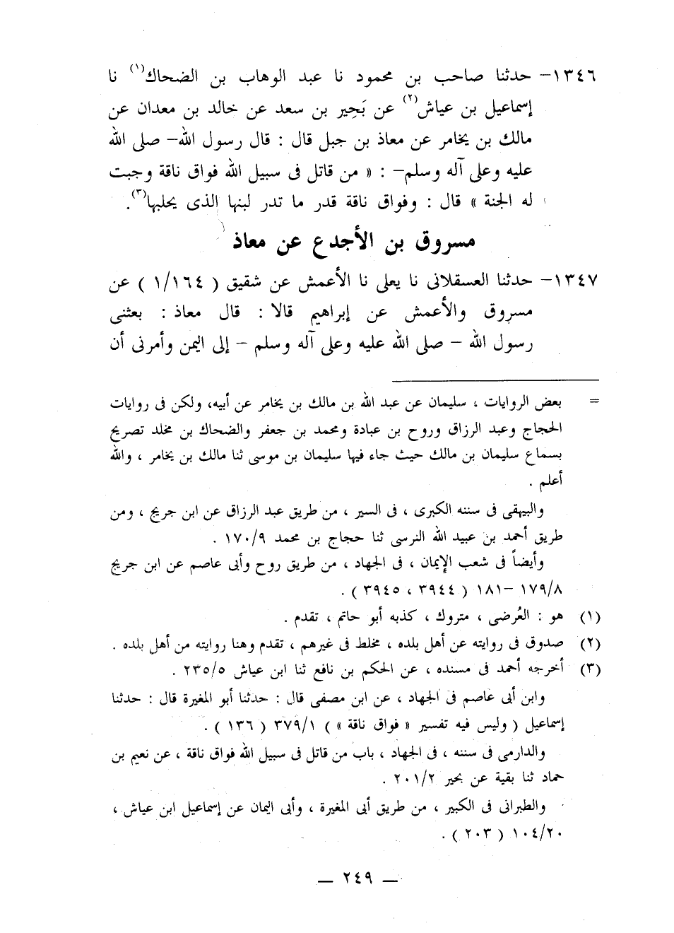 1346 - حَدَّثَنَا صَاحِبُ بْنُ مَحْمُودٍ، نا عَبْدُ الْوَهَّابِ بْنُ الضَّحَّاكِ، نا إِسْمَاعِيلُ بْنُ عَيَّاشٍ، عَنْ بَحِيرِ بْنِ سَعْدٍ، عَنْ خَالِدِ بْنِ مَعْدَانَ، عَنْ مَالِكِ بْنِ يُخَامِرَ، عَنْ مُعَاذِ بْنِ جَبَلٍ، قَالَ: قَالَ رَسُولُ اللَّهِ صَلَّى اللَّهُ عَلَيْهِ وَعَلَى آلِهِ وَسَلَّمَ: «§مَنْ قَاتَلَ فِي سَبِيلِ اللَّهِ فُوَاقَ نَاقَةٍ وَجَبَتْ لَهُ الْجَنَّةُ» . قَالَ: وَفُوَاقُ نَاقَةٍ قَدْرُ مَا تُدِرُّ لَبَنَهَا، الَّذِي يَحْلِبُهَا