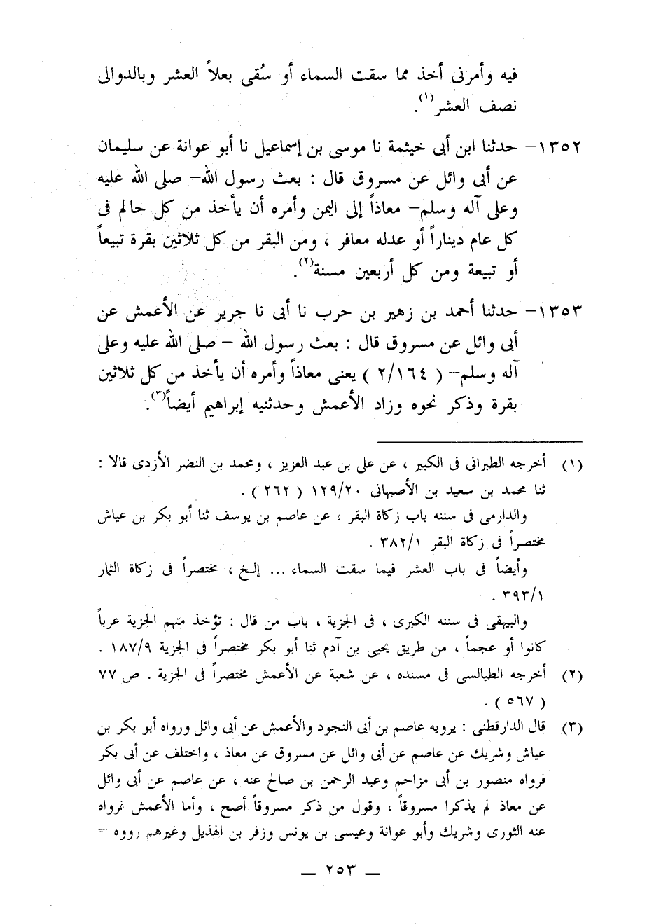 1353 - حَدَّثَنَا أَحْمَدُ بْنُ زُهَيْرِ بْنِ حَرْبٍ، نا أَبِي نا جَرِيرٌ، عَنِ الْأَعْمَشِ، عَنْ أَبِي وَائِلٍ، عَنْ مَسْرُوقٍ، قَالَ: بَعَثَ رَسُولُ اللَّهِ صَلَّى اللَّهُ عَلَيْهِ وَعَلَى آلِهِ وَسَلَّمَ، يَعْنِي مُعَاذًا، وَأَمَرَهُ أَنْ يَأْخُذَ مِنْ كُلِّ ثَلَاثِينَ بَقَرَةً، وَذَكَرَ نَحْوَهُ، وَزَادَ الْأَعْمَشُ وَحَدَّثَنِيهِ إِبْرَاهِيمُ أَيْضًا