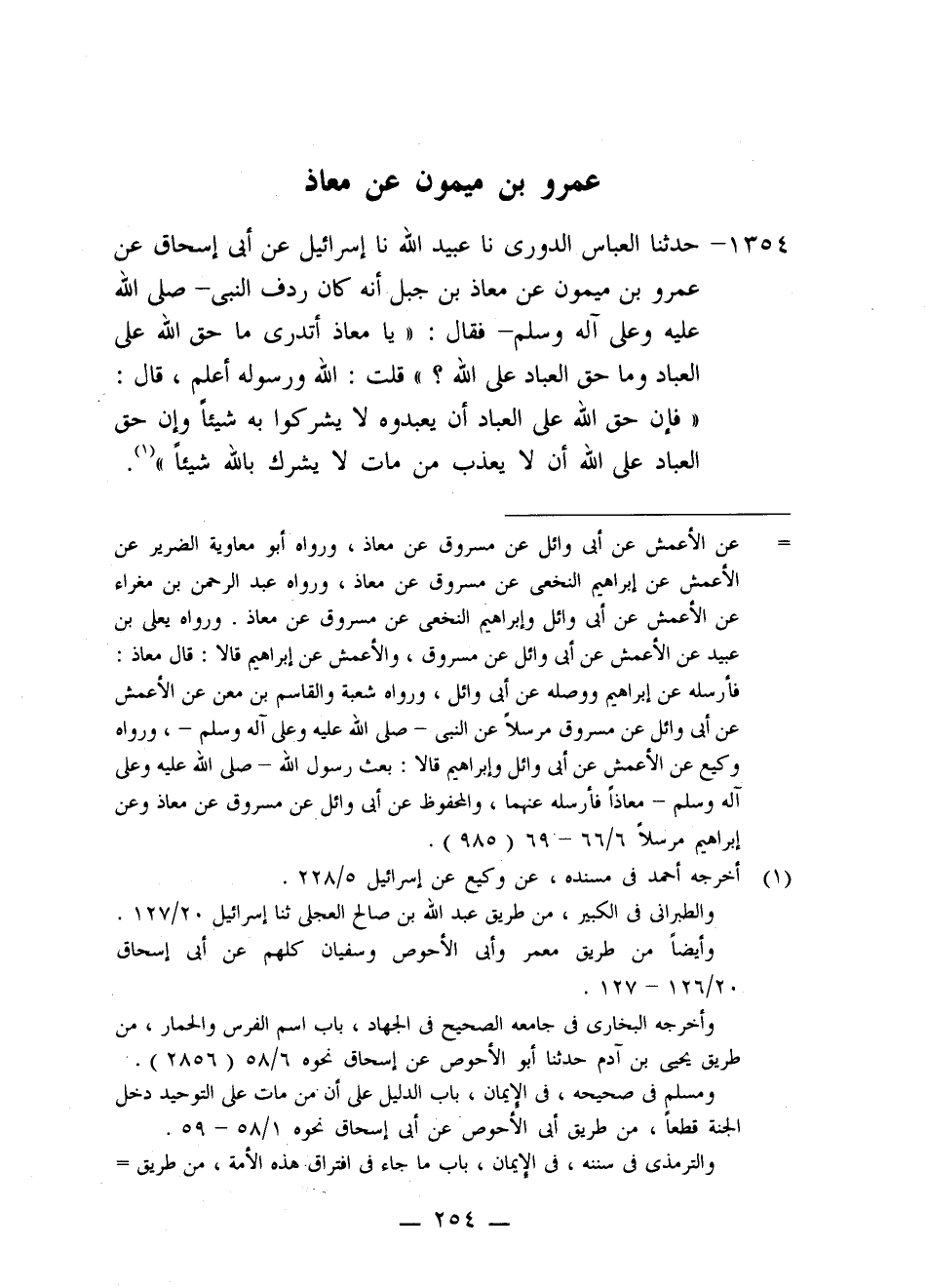 1354 - حَدَّثَنَا الْعَبَّاسُ الدُّورِيُّ، نا عُبَيْدُ اللَّهِ، نا إِسْرَائِيلُ، عَنْ أَبِي إِسْحَاقَ، عَنْ عَمْرِو بْنِ مَيْمُونٍ، عَنْ مُعَاذِ بْنِ جَبَلٍ، أَنَّهُ كَانَ رِدْفَ النَّبِيِّ صَلَّى اللَّهُ عَلَيْهِ وَعَلَى آلِهِ وَسَلَّمَ فَقَالَ: «يَا مُعَاذُ §أَتَدْرِي مَا حَقُّ اللَّهِ عَلَى الْعِبَادِ وَمَا حَقُّ الْعِبَادِ عَلَى اللَّهِ؟» قُلْتُ: اللَّهُ وَرَسُولُهُ أَعْلَمُ، قَالَ: «فَإِنَّ حَقَّ اللَّهِ عَلَى الْعِبَادِ أَنْ يَعْبُدُوهُ لَا يُشْرِكُوا بِهِ شَيْئًا وَإِنَّ حَقَّ الْعِبَادِ عَلَى اللَّهِ أَنْ لَا يُعَذِّبَ مَنْ مَاتَ لَا يُشْرِكُ بِاللَّهِ شَيْئًا»