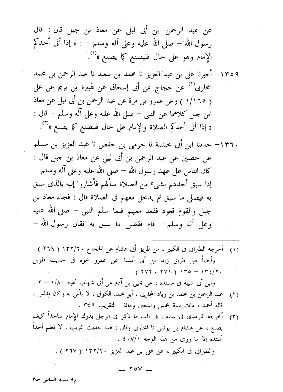 1360 - حَدَّثَنَا ابْنُ أَبِي خَيْثَمَةَ، نا حَرَمِيُّ بْنُ حَفْصٍ، نا عَبْدُ الْعَزِيزِ بْنُ مُسْلِمٍ، عَنْ حُصَيْنٍ، عَنْ عَبْدِ الرَّحْمَنِ بْنِ أَبِي لَيْلَى، عَنْ مُعَاذِ بْنِ جَبَلٍ، قَالَ: كَانَ النَّاسُ عَلَى عَهْدِ رَسُولِ اللَّهِ صَلَّى اللَّهُ عَلَيْهِ وَعَلَى آلِهِ وَسَلَّمَ إِذَا سُبِقَ أَحَدُهُمْ بِشَيْءٍ مِنَ الصَّلَاةِ سَأَلَهُمْ فَأَشَارُوا إِلَيْهِ بِالَّذِي سُبِقَ بِهِ فَيُصَلِّي مَا سُبِقَ ثُمَّ يَدْخُلُ مَعَهُمْ فِي الصَّلَاةِ، قَالَ: فَجَاءَ مُعَاذُ بْنُ جَبَلٍ وَالْقَوْمُ قُعُودٌ فَلَمَّا سَلَّمَ النَّبِيُّ صَلَّى اللَّهُ عَلَيْهِ وَعَلَى آلِهِ وَسَلَّمَ قَامَ فَقَضَى مَا سُبِقَ بِهِ فَقَالَ رَسُولُ اللَّهِ صَلَّى اللَّهُ عَلَيْهِ وَعَلَى آلِهِ وَسَلَّمَ -[258]-: «§اصْنَعُوا كَمَا صَنَعَ مُعَاذٌ»