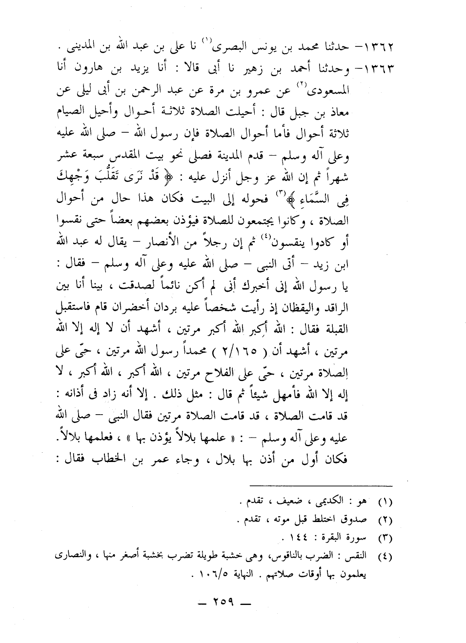 1363 - وَحَدَّثَنَا أَحْمَدُ بْنُ زُهَيْرٍ، نا أَبِي قَالَا: أَنَا يَزِيدُ بْنُ هَارُونَ، أَنَا الْمَسْعُودِيُّ، عَنْ عَمْرِو بْنِ مَرَّةَ، عَنْ عَبْدِ الرَّحْمَنِ بْنِ أَبِي لَيْلَى، عَنْ مُعَاذِ بْنِ جَبَلٍ، قَالَ: §أُحِيلَتِ الصَّلَاةُ ثَلَاثَةَ أَحْوَالٍ، وَأُحِيلَ الصِّيَامُ ثَلَاثَةَ أَحْوَالٍ، فَأَمَّا أَحْوَالُ الصَّلَاةِ: فَإِنَّ رَسُولَ اللَّهِ صَلَّى اللَّهُ عَلَيْهِ وَعَلَى آلِهِ وَسَلَّمَ قَدِمَ الْمَدِينَةَ فَصَلَّى نَحْوَ بَيْتِ الْمَقْدِسِ سَبْعَةَ عَشَرَ شَهْرًا، ثُمَّ إِنَّ اللَّهَ عَزَّ وَجَلَّ أَنْزَلَ عَلَيْهِ {قَدْ نَرَى تَقَلُّبَ وَجْهِكِ فِي السَّمَاءِ} [البقرة: 144] فَحَوَّلَهُ إِلَى الْبَيْتِ، فَكَانَ هَذَا حَالٌ مِنْ أَحْوَالِ الصَّلَاةِ، وَكَانُوا يَجْتَمِعُونَ لِلصَّلَاةِ فَيُؤْذِنُ بَعْضُهُمْ بَعْضًا حَتَّى نَقَسُوا أَوْ كَادُوا يَنْقُسُونَ، ثُم إِنَّ رَجُلًا مِنَ الْأَنْصَارِ يُقَالُ لَهُ عَبْدُ اللَّهِ بْنُ زَيْدٍ أَتَى النَّبِيَّ صَلَّى اللَّهُ عَلَيْهِ وَعَلَى آلِهِ وَسَلَّمَ فَقَالَ: يَا رَسُولَ اللَّهِ إِنِّي أُخْبِرُكَ أَنِّي لَمْ أَكُنْ نَائِمًا لَصَدَقْتُ، بَيْنَا أَنَا بَيْنَ الرَّاقِدِ وَالْيَقْظَانِ إِذْ رَأَيْتُ شَخْصًا عَلَيْهِ بُرْدَانِ أَخْضَرَانِ قَامَ فَاسْتَقْبَلَ الْقِبْلَةَ فَقَالَ: اللَّهُ أَكْبَرُ اللَّهُ أَكْبَرُ مَرَّتَيْنِ، أَشْهَدُ أَنْ لَا إِلَهَ إِلَّا اللَّهُ مَرَّتَيْنِ، أَشْهَدُ أَنَّ مُحَمَّدًا رَسُولُ اللَّهِ مَرَّتَيْنِ، حَيَّ عَلَى الصَّلَاةِ مَرَّتَيْنِ، حَيَّ عَلَى الْفَلَاحِ مَرَّتَيْنِ، اللَّهُ أَكْبَرُ، اللَّهُ أَكْبَرُ، لَا إِلَهَ إِلَّا اللَّهُ فَأَمْهَلَ شَيْئًا ثُمَّ قَالَ: مِثْلَ ذَلِكَ إِلَّا أَنَّهُ زَادَ فِي أَذَانِهِ: قَدْ قَامَتِ الصَّلَاةُ، قَدْ قَامَتِ الصَّلَاةُ مَرَّتَيْنِ، فَقَالَ النَّبِيُّ صَلَّى اللَّهُ عَلَيْهِ وَعَلَى آلِهِ وَسَلَّمَ: «عَلِّمْهَا بِلَالًا يُؤَذِّنُ بِهَا» ، فَعَلَّمَهَا بِلَالًا. فَكَانَ أَوَّلُ مَنْ أَذَّنَ بِهَا بِلَالٌ، وَجَاءَ عُمَرُ بْنُ الْخَطَّابِ فَقَالَ -[260]-: يَا رَسُولَ اللَّهِ لَقَدْ أَطَافَ بِي مِثْلُ الَّذِي أَطَافَ بِعَبْدِ اللَّهِ بْنِ زَيْدٍ اللَّيْلَةَ وَلَكِنْ سَبَقَنِي، وَكَانُوا يَأْتُونَ الصَّلَاةَ، فَإِذَا سُبِقُوا سَأَلُوا كَمْ؟ فَيُشِيرُونَ بِأَصَابِعِهُمْ، وَاحِدَةٍ، ثِنْتَيْنِ، ثَلَاثٍ، فَيَقْضُونَ ثُمَّ يَدْخُلُونَ مَعَهُمْ فِي الصَّلَاةِ، فَجَاءَ ذَاتَ يَوْمٍ مُعَاذُ بْنُ جَبَلٍ وَقَدْ سُبِقَ بَعْضَ الصَّلَاةِ فَجَلَسَ وَقَالَ: لَا أَجِدُهُ عَلَى حَالٍ إِلَّا كُنْتُ عَلَيْهَا، ثُمَّ قَضَيْتُ مَا سَبَقَنِي، فَلَمَّا قَضَى النَّبِيُّ صَلَّى اللَّهُ عَلَيْهِ وَعَلَى آلِهِ وَسَلَّمَ الصَّلَاةَ قَامَ مُعَاذٌ فَقَضَى مَا سُبِقَ بِهِ بَعْدَمَا فَرَغَ النَّبِيُّ صَلَّى اللَّهُ عَلَيْهِ وَعَلَى آلِهِ وَسَلَّمَ فَقَالَ: «إِنَّ مُعَاذًا قَدْ سَنَّ لَكُمْ فَهَكَذَا فَافْعَلُوا» ، وَأَمَّا أَحْوَالُ الصِّيَامِ فَإِنَّ رَسُولَ اللَّهِ صَلَّى اللَّهُ عَلَيْهِ وَعَلَى آلِهِ وَسَلَّمَ قَدِمَ الْمَدِينَةَ فَجَعَلَ يَصُومُ مِنْ كُلِّ شَهْرٍ ثَلَاثَةَ أَيَّامٍ وَصَامَ يَوْمَ عَاشُورَاءَ سَبْعَةَ عَشَرَ شَهْرًا مِنْ رَبِيعٍ الْأَوَّلِ إِلَى رَمَضَانَ ثُمَّ إِنَّ اللَّهَ افْتَرَضَ عَلَيْهِ شَهْرَ رَمَضَانَ فَنَزَلَ {يَا أَيُّهَا الَّذِينَ آمَنُوا كُتِبَ عَلَيْكُمُ الصِّيَامُ} [البقرة: 183] إِلَى قَوْلِهِ {وَعَلَى الَّذِينَ يُطِيقُونَهُ فِدْيَةٌ} [البقرة: 184] ، فَكَانَ مَنْ شَاءَ صَامَ وَمَنْ شَاءَ أَفْطَرَ وَأَطْعَمَ مِسْكِينًا فَأَجْزَأَ ذَلِكَ عَنْهُ، ثُمَّ إِنَّ اللَّهَ جَلَّ وَعَزَّ أَوْجَبَ صِيَامَهُ عَلَى الْمُقِيمِ الصَّحِيحِ، وَرَخَّصَ ف