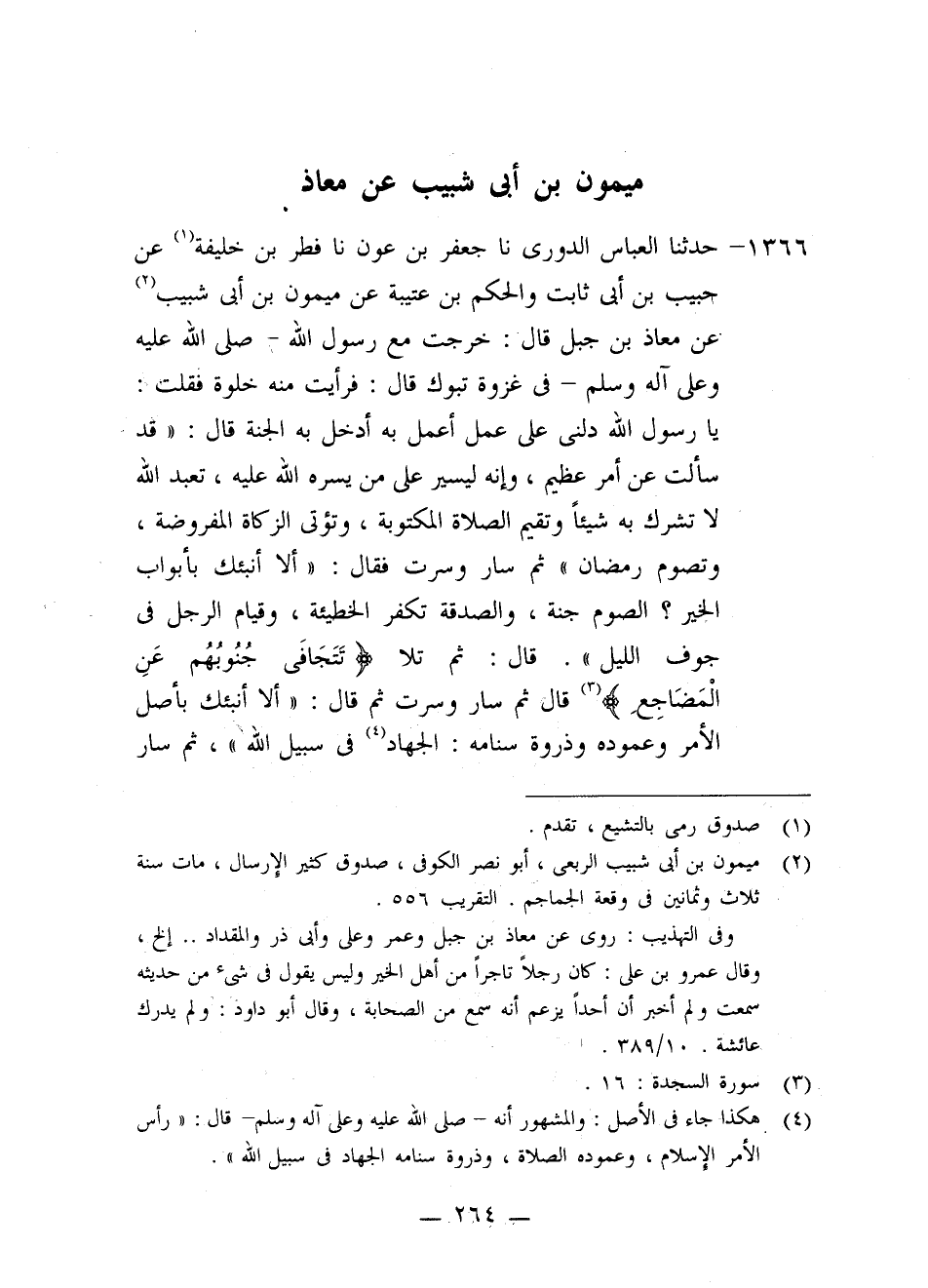 1366 - حَدَّثَنَا الْعَبَّاسُ الدُّورِيُّ، نا جَعْفَرُ بْنُ عَوْنٍ، نا فِطْرُ بْنُ خَلِيفَةَ، عَنْ حَبِيبِ بْنِ أَبِي ثَابِتٍ، وَالْحَكَمِ بْنِ عُتَيْبَةَ، عَنْ مَيْمُونِ بْنِ أَبِي شَبِيبٍ، عَنْ مُعَاذِ بْنِ جَبَلٍ، قَالَ: خَرَجْتُ مَعَ رَسُولِ اللَّهِ صَلَّى اللَّهُ عَلَيْهِ وَعَلَى آلِهِ وَسَلَّمَ فِي غَزْوَةِ تَبُوكَ قَالَ: فَرَأَيْتُ مِنْهُ خَلْوَةً فَقُلْتُ: يَا رَسُولَ اللَّهِ دُلَّنِي عَلَى عَمِلٍ أَعْمَلُ بِهِ أَدْخَلُ بِهِ الْجَنَّةَ قَالَ: «قَدْ سَأَلْتَ عَنْ أَمَرٍ عَظِيمٍ، وَإِنَّهُ لَيَسِيرٌ عَلَى مَنْ يَسَّرَهُ اللَّهُ عَلَيْهِ، §تَعْبُدُ اللَّهَ لَا تُشْرِكُ بِهِ شَيْئًا وَتُقِيمُ الصَّلَاةَ الْمَكْتُوبَةَ، وَتُؤْتِي الزَّكَاةَ الْمَفْرُوضَةَ، وَتَصُومُ رَمَضَانَ» ، ثُمَّ سَارَ وَسِرْتُ فَقَالَ: «أَلَا أُنَبِّئُكَ بِأَبْوَابِ الْخَيْرِ؟ الصَّوْمُ جُنَّةٌ، وَالصَّدَقَةُ تُكَفِّرُ الْخَطِيئَةَ، وَقِيَامُ الرَّجُلِ فِي جَوْفِ اللَّيْلِ» قَالَ: ثُمَّ تَلَا: {تَتَجَافَى جُنُوبُهُمْ عَنِ الْمَضَاجِعِ} [السجدة: 16] ، قَالَ: ثُمَّ سَارَ وَسِرْتُ ثُمَّ قَالَ: " أَلَا أُنَبِّئُكَ بِأَصْلِ الْأَمْرِ وَعَمُودِهِ وَذِرْوَةِ سَنَامِهِ: الْجِهَادُ فِي سَبِيلِ اللَّهِ، ثُمَّ سَارَ -[265]- وَسِرْتُ ثُمَّ قَالَ: أَلَا أُنَبِّئُكَ بِمَا هُوَ أَمْلَكُ عَلَى النَّاسِ مِنْ ذَلِكَ؟ " قَالَ: فَأَوْمَأَ إِلَى فِيهِ. قَالَ: قُلْتُ: يَا رَسُولَ اللَّهِ وَإِنَّا لَنُؤَاخَذُ بِمَا نَتَكَلَّمُ بِهِ؟ قَالَ: «ثَكِلَتْكَ أُمُّكَ يَا ابْنَ جَبَلٍ» وَهُوَ يَقُولُ: «إِلَّا مَا عَلَيْكَ وَلَكَ وَهَلْ يُكَبُّ النَّاسُ عَلَى مَنَاخِرِهِمْ فِي جَهَنَّمَ إِلَّا حَصَائِدُ أَلْسِنَتِهُمْ»
