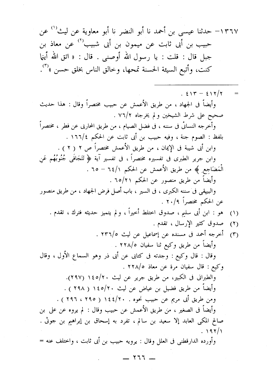 1367 - حَدَّثَنَا عِيسَى بْنُ أَحْمَدَ، نا أَبُو النَّضْرِ، نا أَبُو مُعَاوِيَةَ، عَنْ لَيْثٍ، عَنْ حَبِيبِ بْنِ أَبِي ثَابِتٍ، عَنْ مَيْمُونِ بْنِ أَبِي شَبِيبٍ، عَنْ مُعَاذِ بْنِ جَبَلٍ، قَالَ: قُلْتُ: يَا رَسُولَ اللَّهِ أَوْصِنِي. قَالَ: «§اتَّقِ اللَّهَ أَيْنَمَا كُنْتَ، وَأَتْبِعِ السَّيِّئَةَ الْحَسَنَةَ تَمْحُهَا، وَخَالِقِ النَّاسَ بِخُلُقٍ حَسَنٍ»