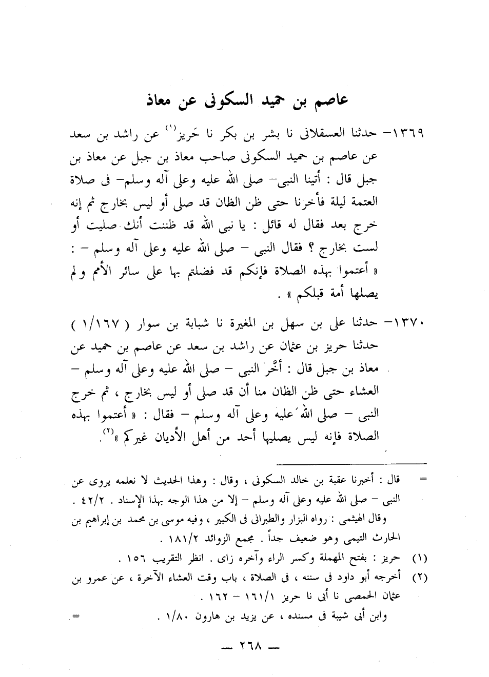 1369 - حَدَّثَنَا الْعَسْقَلَانِيُّ، نا بِشْرُ بْنُ بَكْرٍ، نا حَرِيزٌ، عَنْ رَاشِدِ بْنِ سَعْدٍ، عَنْ عَاصِمِ بْنِ حُمَيْدٍ السَّكُونِيِّ، صَاحِبِ مُعَاذِ بْنِ جَبَلٍ، عَنْ مُعَاذِ بْنِ جَبَلٍ، قَالَ: أَتَيْنَا النَّبِيَّ صَلَّى اللَّهُ عَلَيْهِ وَعَلَى آلِهِ وَسَلَّمَ فِي صَلَاةِ الْعَتَمَةِ لَيْلَةً فَأَخَّرَنَا حَتَّى ظَنَّ الظَّانُّ قَدْ صَلَّى أَوْ لَيْسَ بِخَارِجٍ، ثُمَّ إِنَّهُ خَرَجَ بَعْدُ، فَقَالَ لَهُ قَائِلٌ: يَا نَبِيَّ اللَّهِ قَدْ ظَنَنْتُ أَنَّكَ صَلَّيْتَ أَوْ لَسْتَ بِخَارِجٍ؟ فَقَالَ النَّبِيُّ صَلَّى اللَّهُ عَلَيْهِ وَعَلَى آلِهِ وَسَلَّمَ: «§أَعْتِمُوا بِهَذِهِ الصَّلَاةِ فَإِنَّكُمْ قَدْ فُضِّلْتُمْ بِهَا عَلَى سَائِرِ الْأُمَمِ وَلَمْ يُصَلِّهَا أُمَّةٌ قَبْلَكُمْ»