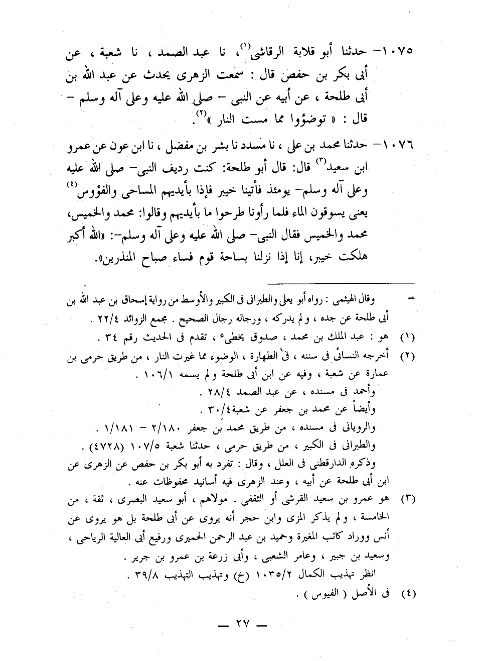 1076 - حَدَّثَنَا مُحَمَّدُ بْنُ عَلِيٍّ، نا مُسَدَّدٌ، نا بِشْرُ بْنُ مُفَضَّلٍ، نا ابْنُ عَوْنٍ، عَنْ عَمْرِو بْنِ سَعِيدٍ، قَالَ: قَالَ أَبُو طَلْحَةَ: كُنْتُ رَدِيفَ النَّبِيِّ صَلَّى اللَّهُ عَلَيْهِ وَعَلَى آلِهِ وَسَلَّمَ، يَوْمَئِذٍ فَأَتَيْنَا خَيْبَرَ فَإِذَا بِأَيْدِيهِمُ الْمَسَاحِي وَالْفُئُوسُ يَعْنِي يَسْقُونَ الْمَاءَ فَلَمَّا رَأَوْنَا طَرَحُوا مَا بِأَيْدِيهِمْ وَقَالُوا: مُحَمَّدٌ وَالْخَمِيسُ، مُحَمَّدٌ وَالْخَمِيسُ، فَقَالَ النَّبِيُّ صَلَّى اللَّهُ عَلَيْهِ وَعَلَى آلِهِ وَسَلَّمَ: «§اللَّهُ أَكْبَرُ هَلَكَتْ خَيْبَرُ، إِنَّا إِذَا نَزَلْنَا بِسَاحَةِ قَوْمٍ فَسَاءَ صَبَاحُ الْمُنْذَرِينَ»