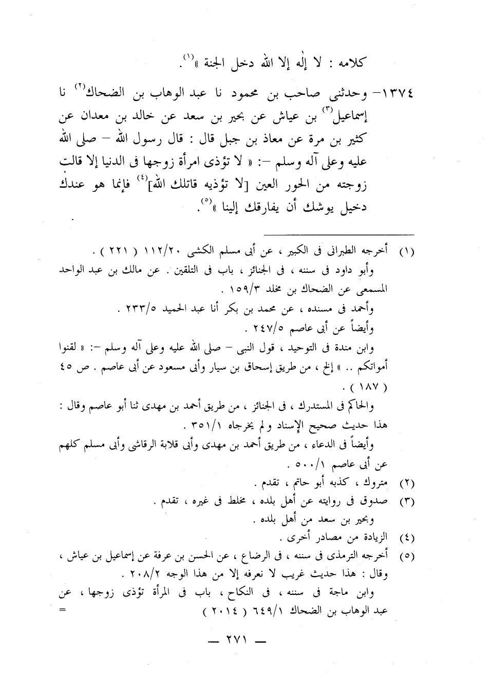 1374 - وَحَدَّثَنِي صَاحِبُ بْنُ مَحْمُودٍ، نا عَبْدُ الْوَهَّابِ بْنُ الضَّحَّاكِ، نا إِسْمَاعِيلُ بْنُ عَيَّاشٍ، عَنْ بَحِيرِ بْنِ سَعْدٍ، عَنْ خَالِدِ بْنِ مَعْدَانَ، عَنْ كَثِيرِ بْنِ مُرَّةَ، عَنْ مُعَاذِ بْنِ جَبَلٍ، قَالَ: قَالَ رَسُولُ اللَّهِ صَلَّى اللَّهُ عَلَيْهِ وَعَلَى آلِهِ وَسَلَّمَ: «§لَا تُؤْذِي امْرَأَةٌ زَوْجَهَا فِي الدُّنْيَا إِلَّا قَالَتْ زَوْجَتُهُ مِنَ الْحُورِ الْعَيْنِ لَا تُؤْذِيهِ قَاتَلَكِ اللَّهُ فَإِنَّمَا هُوَ عِنْدَكِ دَخِيلٌ يُوشِكُ أَنْ يُفَارِقَكِ إِلَيْنَا»
