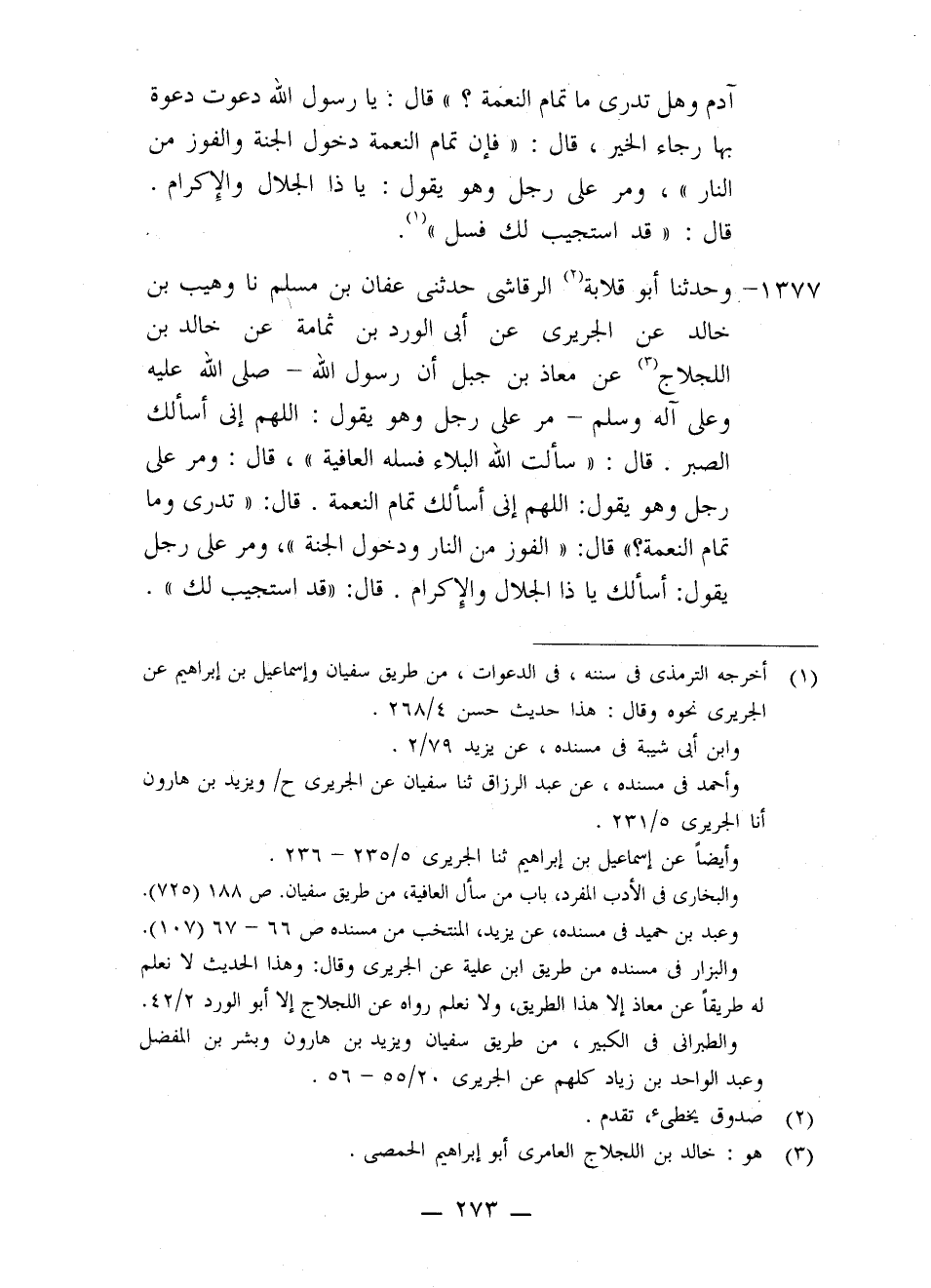 1377 - وَحَدَّثَنَا أَبُو قِلَابَةَ الرَّقَاشِيُّ، حَدَّثَنِي عَفَّانُ بْنُ مُسْلِمٍ، نا وُهَيْبُ بْنُ خَالِدٍ، عَنِ الْجُرَيْرِيِّ، عَنْ أَبِي الْوَرْدِ بْنِ ثُمَامَةَ، عَنْ خَالِدِ بْنِ اللَّجْلَاجِ، عَنْ مُعَاذِ بْنِ جَبَلٍ، أَنَّ رَسُولَ اللَّهِ صَلَّى اللَّهُ عَلَيْهِ وَعَلَى آلِهِ وَسَلَّمَ مَرَّ عَلَى رَجُلٍ وَهُوَ يَقُولُ: اللَّهُمَّ إِنِّي أَسْأَلُكَ الصَّبْرَ، قَالَ: «§سَأَلْتَ اللَّهَ الْبَلَاءَ فَسَلْهُ الْعَافِيَةَ» ، قَالَ: وَمَرَّ عَلَى رَجُلٍ وَهُوَ يَقُولُ: اللَّهُمَّ إِنِّي أَسْأَلُكَ تَمَامَ النِّعْمَةِ؟ قَالَ: «تَدْرِي وَمَا تَمَامُ النِّعْمَةِ؟» قَالَ: «الْفَوْزُ مِنَ النَّارِ وَدُخُولُ الْجَنَّةِ» ، وَمَرَّ عَلَى رَجُلٍ يَقُولُ: أَسْأَلُكَ يَا ذَا الْجَلَالِ وَالْإِكْرَامِ، قَالَ: «قَدِ اسْتُجِيبَ لَكَ»