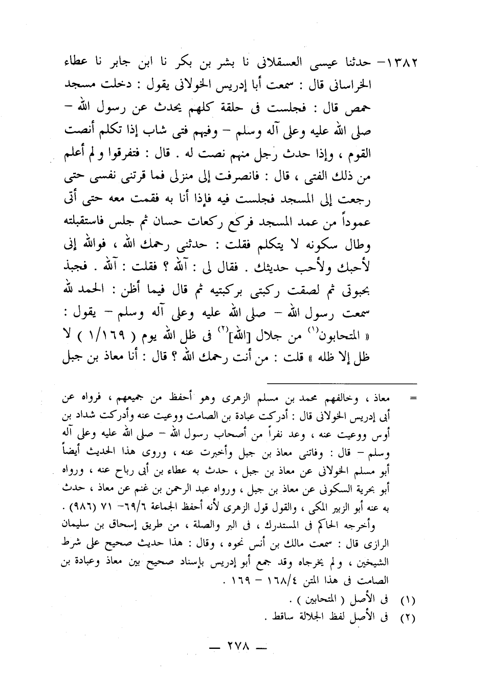 1382 - حَدَّثَنَا عِيسَى الْعَسْقَلَانِيُّ، نا بِشْرُ بْنُ بَكْرٍ، نا ابْنُ جَابِرٍ، نا عَطَاءُ الْخُرَسَانِيُّ، قَالَ: سَمِعْتُ أَبَا إِدْرِيسَ الْخَوْلَانِيُّ، يَقُولُ: دَخَلْتُ مَسْجِدَ حِمْصَ قَالَ: فَجَلَسْتُ فِي حَلْقَةٍ كُلُّهُمْ يُحَدِّثُ عَنْ رَسُولِ اللَّهِ صَلَّى اللَّهُ عَلَيْهِ وَعَلَى آلِهِ وَسَلَّمَ، وَفِيهِمْ فَتًى شَابٌّ إِذَا تَكَلَّمَ أَنْصَتَ الْقَوْمُ، وَإِذَا حَدَّثَ رَجُلًا مِنْهُمْ نَصَتَ لَهُ، قَالَ: فَتَفَرَّقُوا وَلَمْ أَعْلَمْ مَنْ ذَلِكَ الْفَتَى، قَالَ: فَانْصَرَفْتُ إِلَى مَنْزِلِي فَمَا قَرَّتْنِي نَفْسِي حَتَّى رَجَعْتُ إِلَى الْمَسْجِدِ فَجَلَسْتُ فِيهِ فَإِذَا أَنَا بِهِ فَقُمْتُ مَعَهُ حَتَّى أَتَى عَمُودًا مِنْ عُمُدِ الْمَسْجِدِ فَرَكَعَ رَكَعَاتٍ حِسَانٍ، ثُمَّ جَلَسَ فَاسْتَقْبَلْتُهُ وَطَالَ سُكُونُهُ لَا يَتَكَلَّمُ، فَقُلْتُ: حَدِّثْنِي رَحِمَكَ اللَّهُ، فَوَاللَّهِ إِنِّي لَأُحِبُّكَ وَلَأُحِبُّ حَدِيثَكَ، فَقَالَ لِي: آللَّهِ؟ فَقُلْتُ: آللَّهِ، فَجَبَذَ بِحُبْوَتِي ثُمَّ لَصِقْتُ رُكْبَتَيَّ بِرُكْبَتَيْهِ، ثُمَّ قَالَ، فِيمَا أَظُنُّ: الْحَمْدُ لِلَّهِ، سَمِعْتُ رَسُولَ اللَّهِ صَلَّى اللَّهُ عَلَيْهِ وَعَلَى آلِهِ وَسَلَّمَ يَقُولُ: الْمُتَحَابُّونَ مِنْ جَلَالِ اللَّهِ فِي ظِلِّ اللَّهِ يَوْمَ لَا ظِلَّ إِلَّا ظِلُّهُ، قُلْتُ: مَنْ أَنْتَ رَحِمَكَ اللَّهُ؟ قَالَ: أَنَا مُعَاذُ بْنُ جَبَلٍ -[279]- فَقُمْتُ مِنْ عِنْدِهِ فَإِذَا أَنَا بِعُبَادَةَ بْنِ الصَّامِتِ فَقُلْتُ: يَا أَبَا الْوَلِيدِ إِنَّ مُعَاذًا حَدَّثَنِي حَدِيثًا، قَالَ: وَمَا الَّذِي حَدَّثَكَ؟ قَالَ: سَمِعْتُ رَسُولَ اللَّهِ صَلَّى اللَّهُ عَلَيْهِ وَعَلَى آلِهِ وَسَلَّمَ يَقُولُ: الْمُتَحَابُّونَ مِنْ جَلَالِ اللَّهِ فِي ظِلِّ اللَّهِ يَوْمَ لَا ظِلَّ إِلَّا ظِلُّهُ، فَقَالَ لِي عُبَادَةُ: تَعَالَى أُحَدِّثُكَ مَا سَمِعْتُ مِنْ رَسُولِ اللَّهِ، صَلَّى اللَّهُ عَلَيْهِ وَعَلَى آلِهِ وَسَلَّمَ، يَرْوِي عَنْ رَبِّهِ، جَلَّ وَعَزَّ، قَالَ: فَأَتَيْتُهُ فَقَالَ: سَمِعْتُ رَسُولَ اللَّهِ صَلَّى اللَّهُ عَلَيْهِ وَعَلَى آلِهِ وَسَلَّمَ يَقُولُ: قَالَ رَبُّكَ: " §حَقَّتْ مَحَبَّتِي لِلْمُتَحَابِّينَ فِيَّ، وَحَقَّتْ مَحَبَّتِي عَلَى الْمُتَجَالِسِينَ فِيَّ: وَحَقَّتْ مَحَبَّتِي عَلَى الْمُتَزَاوِرِينَ فِيَّ، وَحَقَّتْ مَحَبَّتِي عَلَى الْمُتَبَاذِلِينَ فِيَّ "