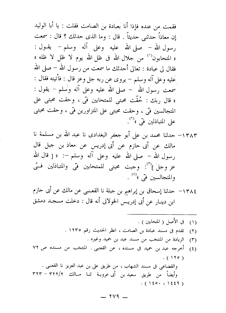 1384 - حَدَّثَنَا إِسْحَاقُ بْنُ إِبْرَاهِيمَ بْنِ جَبَلَةَ، نا الْقَعْنَبِيُّ، عَنْ مَالِكٍ، عَنْ أَبِي حَازِمِ بْنِ دِينَارٍ، عَنْ أَبِي إِدْرِيسَ الْخَوْلَانِيُّ، أَنَّهُ قَالَ: دَخَلْتُ مَسْجِدَ دِمَشْقَ -[280]- فَإِذَا أَنَا بِفَتًى بَرَّاقِ الثَّنَايَا طَوِيلِ الصَّمْتِ فَإِذَا النَّاسُ مَعَهُ، إِذَا اخْتَلَفُوا فِي شَيْءٍ أَسْنَدُوا إِلَيْهِ وَصَدَرُوا عَنْ رَأْيِهِ. فَسَأَلْتُ عَنْهُ، فَقِيلَ: هَذَا مُعَاذُ بْنُ جَبَلٍ، فَلَمَّا كَانَ الْغَدُ هَجَّرْتُهُ فَوَجَدْتُهُ قَدْ سَبَقَنِي بِالتَّهْجِيرِ، وَوَجَدْتُهُ يُصَلِّي فَانْتَظَرْتُهُ حَتَّى قَضَى صَلَاتَهُ ثُمَّ جِئْتُهُ مِنْ قِبَلِ وَجْهِهِ فَسَلَّمْتُ عَلَيْهِ وَقُلْتُ لَهُ: وَاللَّهِ إِنِّي لَأُحِبُّكَ فَقَالَ: آللَّهِ؟ فَقُلْتُ: آللَّهِ. قَالَ: آللَّهِ؟ فَقُلْتُ: آللَّهِ. قَالَ: فَأَخَذَ بِحُبْوَةِ رِدَائِي وَجَبَذَنِي إِلَيْهِ وَقَالَ: أَبْشِرْ فَإِنِّي سَمِعْتُ رَسُولَ اللَّهِ صَلَّى اللَّهُ عَلَيْهِ وَعَلَى آلِهِ وَسَلَّمَ يَقُولُ: قَالَ اللَّهُ عَزَّ وَجَلَّ «§وَجَبَتْ مَحَبَّتِي لِلْمُتَحَابِّينَ فِيَّ، وَالْمُتَبَاذِلِينَ فِيَّ، وَالْمُتَزَاوِرِينَ فِيَّ»