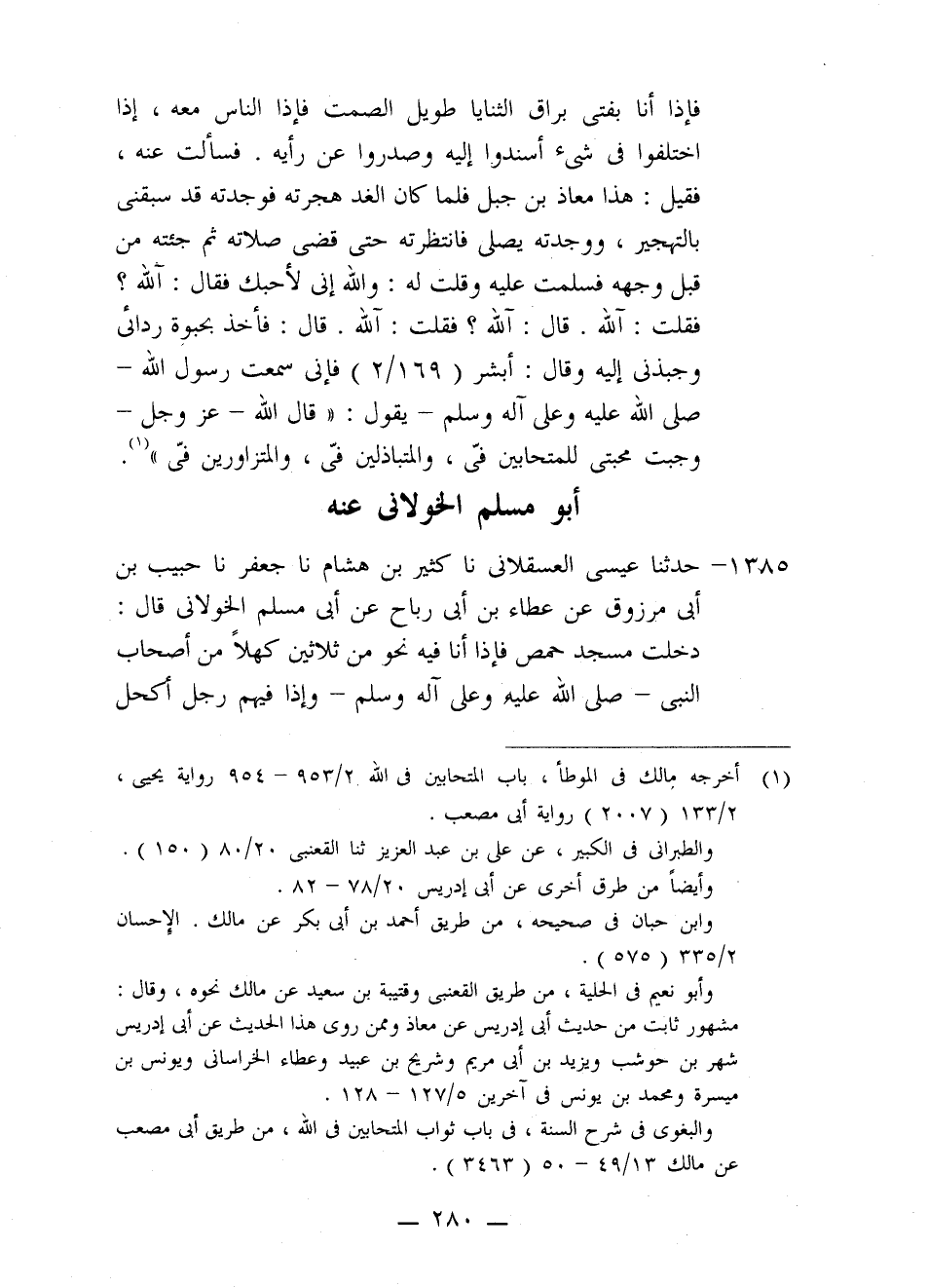1385 - حَدَّثَنَا عِيسَى الْعَسْقَلَانِيُّ، نا كَثِيرُ بْنُ هِشَامٍ، نا جَعْفَرٌ، نا حَبِيبُ بْنُ أَبِي مَرْزُوقٍ، عَنْ عَطَاءِ بْنِ أَبِي رَبَاحٍ، عَنْ أَبِي مُسْلِمٍ الْخَوْلَانِيُّ، قَالَ: دَخَلْتُ مَسْجِدَ حِمْصَ فَإِذَا أَنَا فِيهِ نَحْوٌ مِنْ ثَلَاثِينَ كَهْلًا مِنْ أَصْحَابِ النَّبِيِّ صَلَّى اللَّهُ عَلَيْهِ وَعَلَى آلِهِ وَسَلَّمَ وَإِذَا فِيهِمْ رَجُلٌ أَكْحَلُ -[281]- الْعَيْنَيْنِ، بَرَّاقُ الثَّنَايَا، سَاكِتٌ لَا يَتَكَلَّمُ، فَإِذَا امْتَرَى الْقَوْمُ فِي شَيْءٍ أَقْبَلُوا عَلَيْهِ فَسَأَلُوهُ، فَقُلْتُ لِجَلِيسٍ لِي: مَنْ هَذَا؟ قَالَ: مُعَاذُ بْنُ جَبَلٍ فَوَقَعَ لَهُ فِي نَفْسِي حُبٌّ فَكُنْتُ مَعَهُمْ حَتَّى تَفَرَّقُوا ثُمُّ هَجَّرْتُ إِلَى الْمَسْجِدِ فَإِذَا مُعَاذُ بْنُ جَبَلٍ قَائِمٌ يُصَلِّي إِلَى سَارِيَةٍ فَصَلَّيْتُ ثُمَّ جَلَسْتُ وَاحْتَبَيْتُ بِرِدَائِي، وَجَلَسَ فَسَكَتُّ لَا أُكَلِّمُهُ وَسَكَتَ لَا يُكَلِّمُنِي ثُمَّ قُلْتُ: وَاللَّهِ إِنِّي لَأُحِبُّكَ. قَالَ: فِيمَ تُحِبُّنِي؟ قَالَ: قُلْتُ: فِي اللَّهِ قَالَ: فَأَخَذَ بِحُبْوَتِي فَجَرَّنِي إِلَيْهِ هُنَيْئَةً ثُمَّ قَالَ: أَبْشِرْ إِنْ كُنْتَ صَادِقًا، سَمِعْتُ رَسُولَ اللَّهِ صَلَّى اللَّهُ عَلَيْهِ وَعَلَى آلِهِ وَسَلَّمَ يَقُولُ: الْمُتَحَابُّونَ فِي جَلَالِ اللَّهِ لَهُمْ مَنَابِرُ مِنْ نُورٍ يُغْبَطُ بِهِمُ النَّبِيُّونَ وَالشُّهَدَاءُ. قَالَ: فَخَرَجْتُ فَلَقِيتُ عُبَادَةَ بْنَ الصَّامِتِ فَقُلْتُ: أَبَا الْوَلِيدِ أَلَا أُحَدِّثُكَ بِمَا حَدَّثَنِي مُعَاذٌ فِي الْمُتَحَابِّينَ. قَالَ: فَأَنَا أُحَدِّثُكَ عَنِ النَّبِيِّ صَلَّى اللَّهُ عَلَيْهِ وَعَلَى آلِهِ وَسَلَّمَ يَرْفَعْهُ إِلَى الرَّبِّ عَزَّ وَجَلَّ قَالَ: «§حَقَّتْ مَحَبَّتِي لِلْمُتَحَابِّينَ فِيَّ، وَحَقَّتْ مَحَبَّتِي لِلْمُتَزَاوِرِينَ فِيَّ، وَحَقَّتْ مَحَبَّتِي لِلْمُتَبَاذِلِينَ فِيَّ، وَحَقَّتْ مَحَبَّتِي لِلْمُتَنَاصِحِينَ فِيَّ»