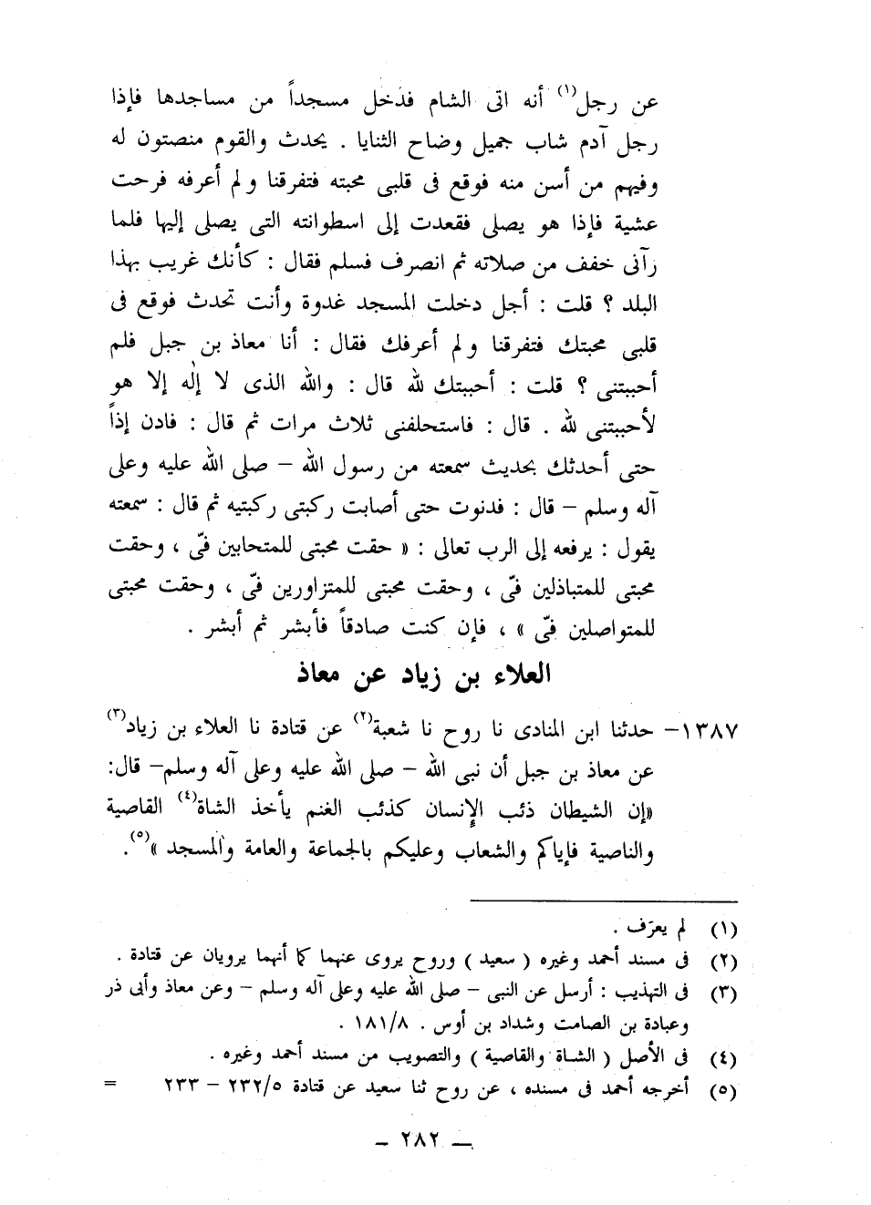 1387 - حَدَّثَنَا ابْنُ الْمُنَادِي، نا رَوْحٌ، نا شُعْبَةُ، عَنْ قَتَادَةَ، نا الْعَلَاءُ بْنُ زِيَادٍ، عَنْ مُعَاذِ بْنِ جَبَلٍ، أَنَّ نَبِيَّ اللَّهِ صَلَّى اللَّهُ عَلَيْهِ وَعَلَى آلِهِ وَسَلَّمَ قَالَ: «إِنَّ §الشَّيْطَانَ ذِئْبُ الْإِنْسَانِ كَذِئْبِ الْغَنَمِ يَأْخُذُ الشَّاةَ الْقَاصِيَةَ وَالنَّاصِيَةَ، فَإِيَّاكُمْ وَالشِّعَابَ وَعَلَيْكُمْ بِالْجَمَاعَةِ وَالْعَامَّةِ وَالْمَسْجِدِ»