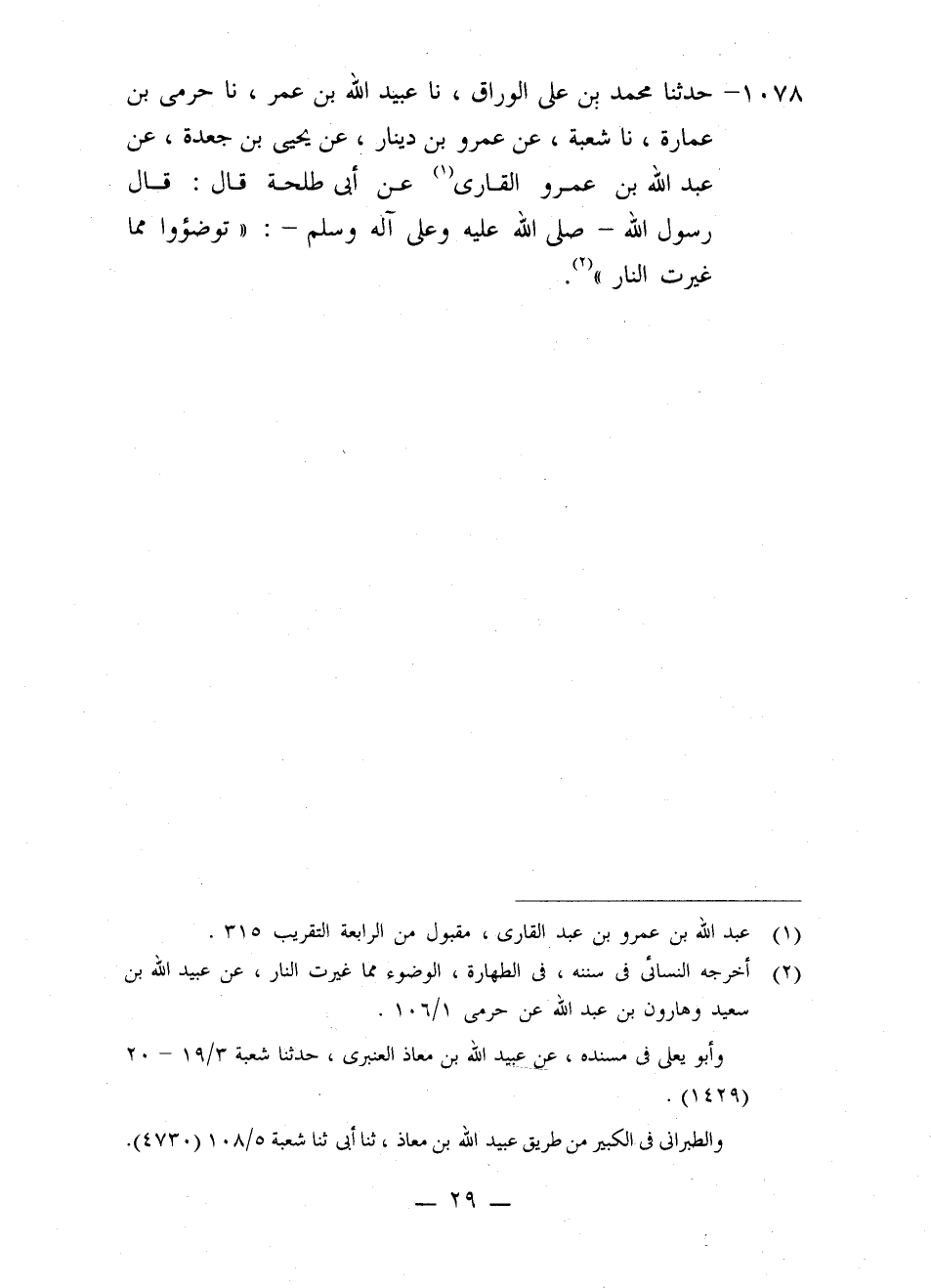1078 - حَدَّثَنَا مُحَمَّدُ بْنُ عَلِيٍّ الْوَرَّاقُ، نا عُبَيْدُ اللَّهِ بْنُ عُمَرَ، نا حَرَمِيُّ بْنُ عُمَارَةَ، نا شُعْبَةُ، عَنْ عَمْرِو بْنِ دِينَارٍ، عَنْ يَحْيَى بْنِ جَعْدَةَ، عَنْ عَبْدِ اللَّهِ بْنِ عَمْرٍو الْقَارِيِّ، عَنْ أَبِي طَلْحَةَ، قَالَ: قَالَ رَسُولُ اللَّهِ صَلَّى اللَّهُ عَلَيْهِ وَعَلَى آلِهِ وَسَلَّمَ: «§تَوَضَّئُوا مِمَّا غَيَّرَتِ النَّارُ»