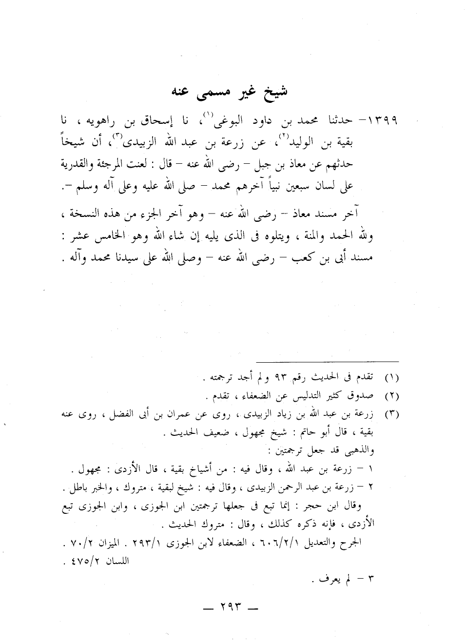 1399 - حَدَّثَنَا مُحَمَّدُ بْنُ دَاوُدَ الْبُوغِيُّ، نا إِسْحَاقُ بْنُ رَاهَوَيْهِ، نا بَقِيَّةُ بْنُ الْوَلِيدِ، عَنْ زُرْعَةَ بْنِ عَبْدِ اللَّهِ الزَّبِيدِيِّ، أَنَّ شَيْخًا حَدَّثَهُمْ، عَنْ مُعَاذِ بْنِ جَبَلٍ، رَضِيَ اللَّهُ عَنْهُ قَالَ: «§لُعِنَتِ الْمُرْجِئَةُ وَالْقَدَرِيَّةُ عَلَى لِسَانِ سَبْعِينَ نَبِيًّا آخِرُهُمْ مُحَمَّدٌ صَلَّى اللَّهُ عَلَيْهِ وَعَلَى آلِهِ وَسَلَّمَ»