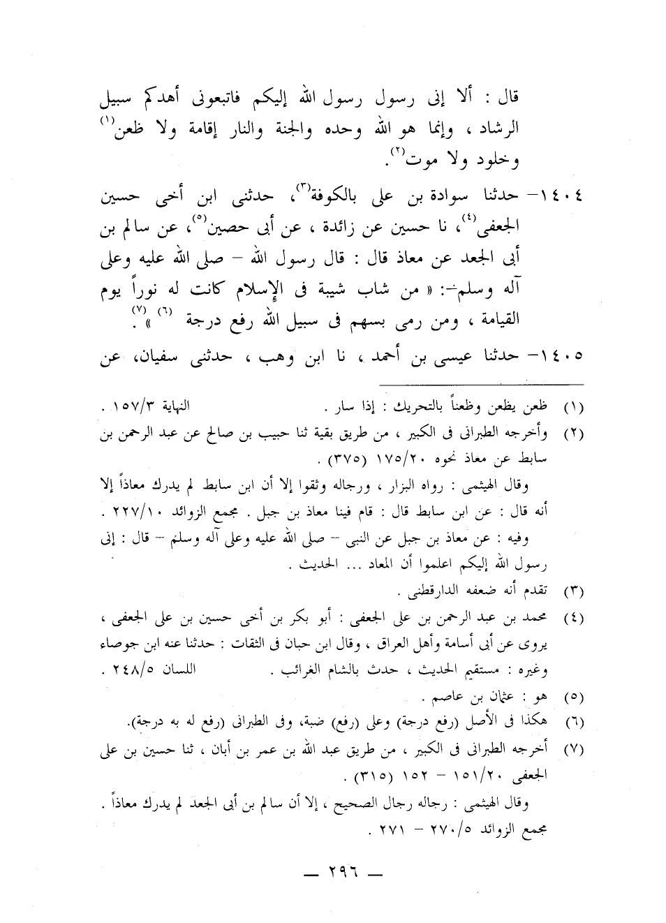 1404 - حَدَّثَنَا سَوَادَةُ بْنُ عَلِيٍّ، بِالْكُوفَةِ، وَحَدَّثَنِي ابْنُ أَخِي حُسَيْنٌ الْجُعْفِيُّ، نا حُسَيْنٌ، عَنْ زَائِدَةَ، عَنْ أَبِي حُصَيْنٍ، عَنْ سَالِمِ بْنِ أَبِي الْجَعْدِ، عَنْ مُعَاذٍ، قَالَ: قَالَ رَسُولُ اللَّهِ صَلَّى اللَّهُ عَلَيْهِ وَعَلَى آلِهِ وَسَلَّمَ: «§مَنْ شَابَ شَيْبَةً فِي الْإِسْلَامِ كَانَتْ لَهُ نُورًا يَوْمَ الْقِيَامَةِ، وَمَنْ رَمَى بِسَهْمٍ فِي سَبِيلِ اللَّهِ رُفِعَ دَرَجَةً»