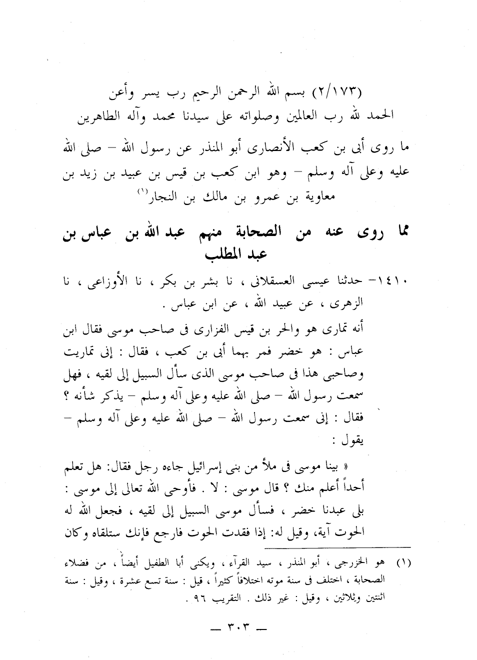 1410 - حَدَّثَنَا عِيسَى الْعَسْقَلَانِيُّ، نا بِشْرُ بْنُ بَكْرٍ، نا الْأَوْزَعِيُّ، نا الزُّهْرِيُّ، عَنْ عُبَيْدِ اللَّهِ، عَنِ ابْنِ عَبَّاسٍ أَنَّهُ تَمَارَى هُوَ وَالْحُرُّ بْنُ قَيْسٍ الْفَزَارِيُّ فِي صَاحِبِ مُوسَى، فَقَالَ ابْنُ عَبَّاسٍ: هُوَ خَضِرٌ فَمَرَّ بِهِمَا أُبَيُّ بْنُ كَعْبٍ، فَقَالَ: إِنِّي تَمَارَيْتُ وَصَاحِبِي هَذَا فِي صَاحِبِ مُوسَى الَّذِي سَأَلَ السَّبِيلَ إِلَى لُقِيِّهِ، فَهَلْ سَمِعْتَ رَسُولَ اللَّهِ، صَلَّى اللَّهُ عَلَيْهِ وَعَلَى آلِهِ وَسَلَّمَ، يَذْكُرُ شَأْنَهُ؟ فَقَالَ: إِنِّي سَمِعْتُ رَسُولَ اللَّهِ، صَلَّى اللَّهُ عَلَيْهِ وَعَلَى آلِهِ وَسَلَّمَ، يَقُولُ: " بَيْنَا مُوسَى فِي مَلَأٍ مِنْ بَنِي إِسْرَائِيلَ جَاءَهُ رَجُلٌ فَقَالَ: §هَلْ تَعْلَمُ أَحَدًا أَعْلَمَ مِنْكَ؟ قَالَ مُوسَى: لَا، فَأَوْحَى اللَّهُ تَعَالَى إِلَى مُوسَى: بَلَى عَبْدُنَا خَضِرٌ، فَسَأَلَ مُوسَى السَّبِيلَ إِلَى لُقِيِّهِ، فَجَعَلَ اللَّهُ لَهُ الْحُوتَ آيَةً، وَقِيلَ لَهُ: إِذَا فَقَدْتَ الْحُوتَ فَارْجِعْ فَإِنَّكَ سَتَلْقَاهُ، وَكَانَ -[304]- مُوسَى يَتْبَعُ أَثَرَ الْحُوتِ فِي الْبَحْرِ، فَقَالَ فَتَى مُوسَى لِمُوسَى: {أَرَأَيْتَ إِذْ أَوَيْنَا إِلَى الصَّخْرَةِ فَإِنِّي نَسِيتُ الْحُوتَ وَمَا أَنْسَانِيهُ إِلَّا الشَّيْطَانُ أَنْ أَذْكُرَهُ} [الكهف: 63] ، فَقَالَ مُوسَى: {ذَلِكَ مَا كُنَّا نَبْغِ فَارْتَدَّا عَلَى آثَارِهِمَا قَصَصًا} [الكهف: 64] فَوَجَدَا خَضِرًا فَكَانَ مِنْ شَأْنِهُمَا الَّذِي قَصَّ اللَّهُ فِي كِتَابِهِ "
