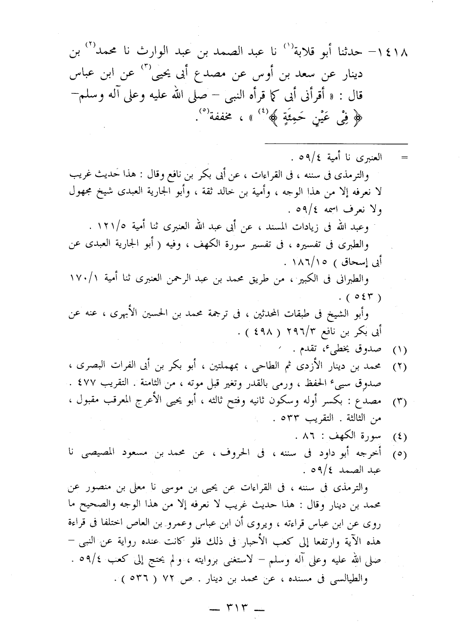 1418 - حَدَّثَنَا أَبُو قِلَابَةَ، نا عَبْدُ الصَّمَدِ بْنُ عَبْدِ الْوَارِثِ، نا مُحَمَّدُ بْنُ دِينَارٍ، عَنْ سَعْدِ بْنِ أَوْسٍ، عَنْ مِصْدَعٍ أَبِي يَحْيَى، عَنِ ابْنِ عَبَّاسٍ، قَالَ: §أَقْرَأَنِي أُبَيٌّ كَمَا قَرَأَهُ النَّبِيُّ صَلَّى اللَّهُ عَلَيْهِ وَعَلَى آلِهِ وَسَلَّمَ {فِي عَيْنٍ حَمِئَةٍ} [الكهف: 86] مُخَفَّفَةً