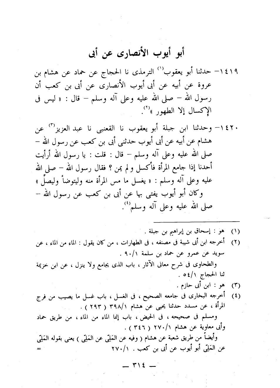 1419 - حَدَّثَنَا أَبُو يَعْقُوبَ التِّرْمِذِيُّ، نا الْحَجَّاجُ، عَنْ حَمَّادٍ، عَنْ هِشَامِ بْنِ عُرْوَةَ، عَنْ أَبِيهِ، عَنْ أَبِي أَيُّوبَ الْأَنْصَارِيُّ، عَنْ أُبَيِّ بْنِ كَعْبٍ، أَنَّ رَسُولَ اللَّهِ صَلَّى اللَّهُ عَلَيْهِ وَعَلَى آلِهِ وَسَلَّمَ قَالَ: «§لَيْسَ فِي الْإِكْسَالِ إِلَّا الطُّهُورُ»