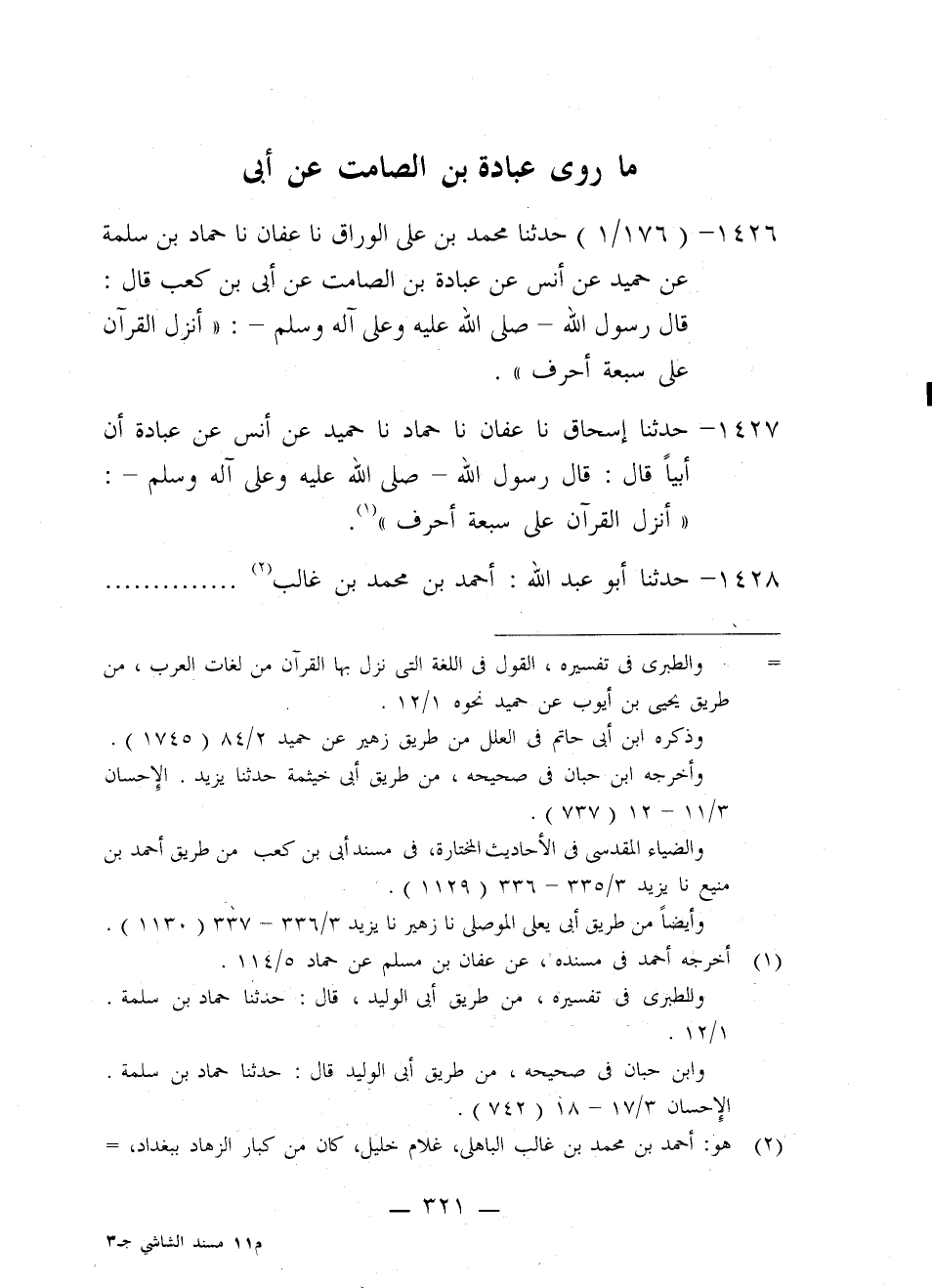 1426 - حَدَّثَنَا مُحَمَّدُ بْنُ عَلِيٍّ الْوَرَّاقُ، نا عَفَّانُ، نا حَمَّادُ بْنُ سَلَمَةَ، عَنْ حُمَيْدٍ، عَنْ أَنَسٍ، عَنْ عُبَادَةَ بْنِ الصَّامِتِ، عَنْ أُبَيِّ بْنِ كَعْبٍ، قَالَ: قَالَ رَسُولُ اللَّهِ صَلَّى اللَّهُ عَلَيْهِ وَعَلَى آلِهِ وَسَلَّمَ: «§أُنْزِلَ الْقُرْآنُ عَلَى سَبْعَةِ أَحْرُفٍ»
