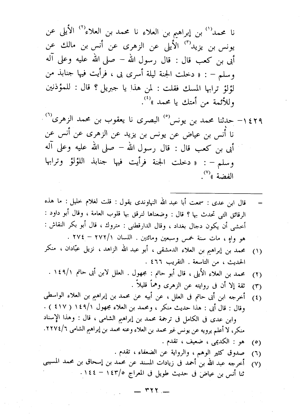 1429 - حَدَّثَنَا مُحَمَّدُ بْنُ يُونُسَ الْبَصْرِيُّ، نا يَعْقُوبُ بْنُ مُحَمَّدٍ الزُّهْرِيُّ، نا أَنَسُ بْنُ عِيَاضٍ، عَنْ يُونُسَ بْنِ يَزِيدَ، عَنِ الزُّهْرِيِّ، عَنْ أَنَسٍ، عَنْ أُبَيِّ بْنِ كَعْبٍ، قَالَ: قَالَ رَسُولُ اللَّهِ صَلَّى اللَّهُ عَلَيْهِ وَعَلَى آلِهِ وَسَلَّمَ: «§دَخَلْتُ الْجَنَّةَ فَرَأَيْتُ فِيهَا جَنَابِذَ اللُّؤْلُؤِ وَتُرَابُهَا الْفِضَّةُ»