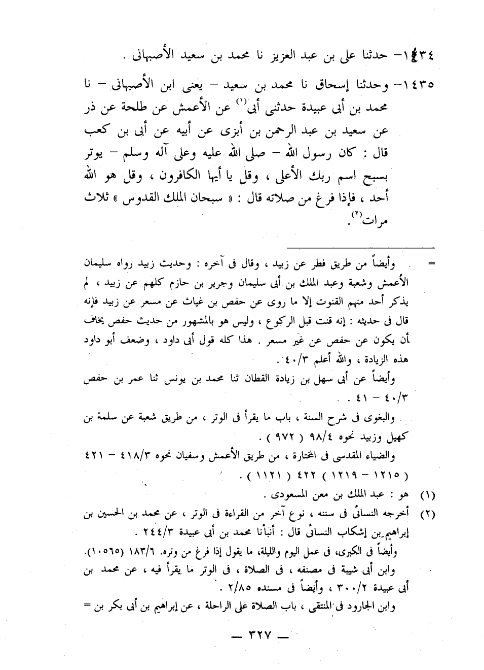 1435 - وَحَدَّثَنَا إِسْحَاقُ، نَا مُحَمَّدُ بْنُ سَعِيدٍ يَعْنِي ابْنَ الْأَصْبَهَانِيِّ، نَا مُحَمَّدُ بْنُ أَبِي عُبَيْدَةَ، حَدَّثَنِي أَبِي، عَنِ الْأَعْمَشِ، عَنْ طَلْحَةَ، عَنْ ذَرٍّ، عَنْ سَعِيدِ بْنِ عَبْدِ الرَّحْمَنِ بْنِ أَبْزَى، عَنْ أَبِيهِ، عَنْ أُبَيِّ بْنِ كَعْبٍ، قَالَ: كَانَ رَسُولُ اللَّهِ صَلَّى اللَّهُ عَلَيْهِ وَعَلَى آلِهِ وَسَلَّمَ §يُوتِرُ بِـ سَبِّحِ اسْمَ رَبِّكَ الْأَعْلَى، وَقُلْ يَا أَيُّهَا الْكَافِرُونَ، وَقُلْ هُوَ اللَّهُ أَحَدُ، فَإِذَا فَرَغَ مِنْ صَلَاتِهِ، قَالَ: «سُبْحَانَ الْمَلِكِ الْقُدُّوسِ ثَلَاثَ مَرَّاتٍ» . وَحَدَّثَنَا إِسْحَاقُ بْنُ إِبْرَاهِيمَ، حَدَّثَنَا إِبْرَاهِيمُ، نَا إِبْرَاهِيمُ بْنُ مُوسَى الرَّازِيُّ، حَدَّثَنَا مُحَمَّدُ بْنُ أَنَسٍ أَبُو أَنَسٍ، نَا الْأَعْمَشُ، بِمِثْلِهِ غَيْرَ أَنَّهُ قَالَ: كَانَ النَّبِيُّ صَلَّى اللَّهُ عَلَيْهِ وَعَلَى آلِهِ وَسَلَّمَ يُوتِرُ بِسَبِّحْ، وَقُلْ لِلَّذِينَ كَفَرُوا، وَاللَّهُ الْوَاحِدُ الصَّمَدُ