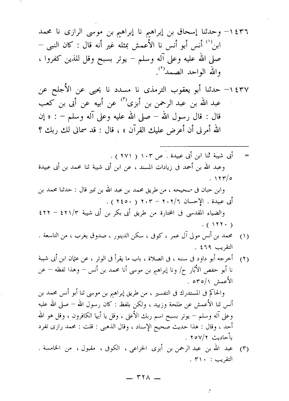 1437 - حَدَّثَنَا أَبُو يَعْقُوبَ التِّرْمِذِيُّ، نا مُسَدَّدٌ، نا يَحْيَى، عَنِ الْأَجْلَحِ، عَنْ عَبْدِ اللَّهِ بْنِ عَبْدِ الرَّحْمَنِ بْنِ أَبْزَى، عَنْ أَبِيهِ، عَنْ أُبَيِّ بْنِ كَعْبٍ، قَالَ: قَالَ رَسُولُ اللَّهِ صَلَّى اللَّهُ عَلَيْهِ وَعَلَى آلِهِ وَسَلَّمَ: «إِنَّ اللَّهَ §أَمَرَنِي أَنْ أَعْرَضَ عَلَيْكَ الْقُرْآنُ» قَالَ: قَدْ سَمَّانِي لَكَ رَبُّكَ؟ -[329]- قَالَ: (بِفَضْلِ اللَّهِ وَرَحْمَتِهِ فَبِذَلِكَ فَلْتَفْرَحُوا) هَكَذَا قَرَأَهَا أُبَيُّ