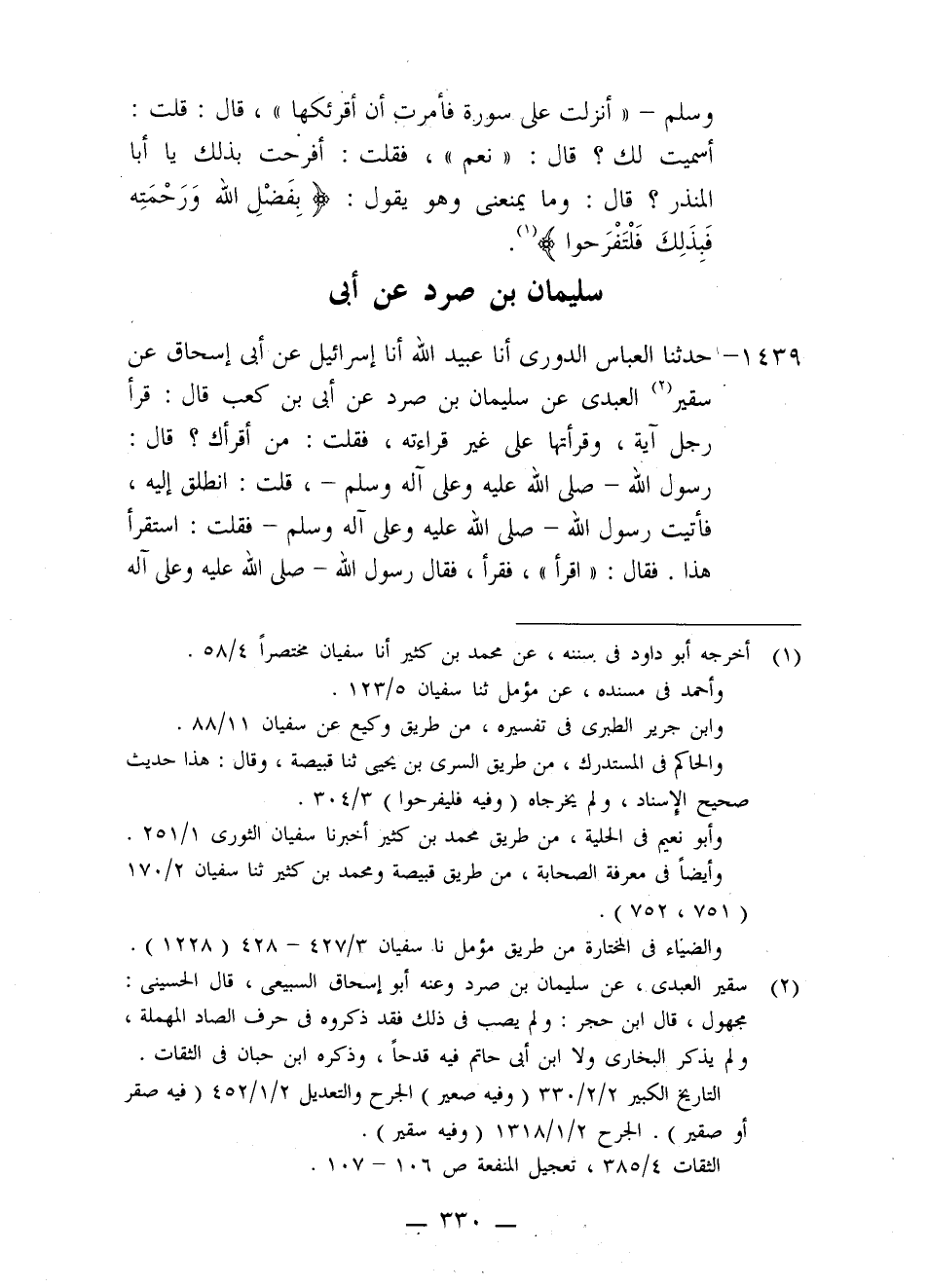 1439 - حَدَّثَنَا الْعَبَّاسُ الدُّورِيُّ، أَنَا عُبَيْدُ اللَّهِ، أَنَا إِسْرَائِيلُ، عَنْ أَبِي إِسْحَاقَ، عَنْ سُقَيْرٍ الْعَبْدِيُّ، عَنْ سُلَيْمَانَ بْنِ صُرَدٍ، عَنْ أُبَيِّ بْنِ كَعْبٍ، قَالَ: قَرَأَ رَجُلٌ آيَةً، وَقَرَأْتُهَا عَلَى غَيْرِ قِرَاءَتِهِ، فَقُلْتُ: مَنْ أَقْرَأَكَ؟ قَالَ: رَسُولُ اللَّهِ صَلَّى اللَّهُ عَلَيْهِ وَعَلَى آلِهِ وَسَلَّمَ، قُلْتُ: انْطَلِقْ إِلَيْهِ، فَأَتَيْتُ رَسُولَ اللَّهِ صَلَّى اللَّهُ عَلَيْهِ وَعَلَى آلِهِ وَسَلَّمَ فَقُلْتُ: اسْتَقْرِأْ هَذَا. فَقَالَ: «اقْرَأْ» ، فَقَرَأَ، فَقَالَ رَسُولُ اللَّهِ صَلَّى اللَّهُ عَلَيْهِ وَعَلَى آلِهِ وَسَلَّمَ -[331]-: «أَحْسَنْتَ» ، فَقُلْتُ: أَوَ لَمْ تُقْرِئْنِي كَذَا وَكَذَا؟ قَالَ: «بَلَى وَأَنْتَ قَدْ أَحْسَنْتَ» . فَقُلْتُ بِيَدِي: قَدْ أَحْسَنْتُ. قَالَ فَضَرَبَ رَسُولُ اللَّهِ صَلَّى اللَّهُ عَلَيْهِ وَعَلَى آلِهِ وَسَلَّمَ بِيَدِهِ فِي صَدْرِي، ثُمَّ قَالَ: «اللَّهُمَّ أَذْهِبْ عَنْ أُبَيٍّ الشَّكَّ» . قَالَ: فَفِضْتُ عَرَقًا وَامْتَلَأَ جَوْفِي فَرَقًا وَقَالَ رَسُولُ اللَّهِ صَلَّى اللَّهُ عَلَيْهِ وَعَلَى آلِهِ وَسَلَّمَ: " يَا أُبَيُّ بْنَ كَعْبٍ إِنَّ مَلَكَيْنِ أَتَيَانِي فَقَالَ أَحَدُهُمَا: اقْرَأْ عَلَى حَرْفٍ، وَقَالَ الْآخَرُ، زِدْهُ، قُلْتُ: زِدْنِي. قَالَ: أَقْرَأْ عَلَى حَرْفَيْنِ، وَقَالَ الْآخَرُ، زِدْهُ، قُلْتُ: زِدْنِي. قَالَ: اقْرَأْ عَلَى ثَلَاثَةِ أَحْرُفٍ، وَقَالَ الْآخَرُ، زِدْهُ، قُلْتُ: زِدْنِي. قَالَ: اقْرَأْهُ عَلَى أَرْبَعَةِ أَحْرُفٍ، وَقَالَ الْآخَرُ، زِدْهُ، قُلْتُ: زِدْنِي. قَالَ: اقْرَأْهُ عَلَى خَمْسَةِ أَحْرُفٍ، وَقَالَ الْآخَرُ، زِدْهُ، قُلْتُ: زِدْنِي. قَالَ: اقْرَأْهُ عَلَى سِتَّةِ أَحْرُفٍ، وَقَالَ الْآخَرُ، زِدْهُ، قُلْتُ: زِدْنِي. قَالَ: اقْرَأْهُ عَلَى سَبْعَةِ أَحْرُفٍ، فَإِنَّ §الْقُرْآنَ أُنْزِلَ عَلَى سَبْعَةِ أَحْرُفٍ "