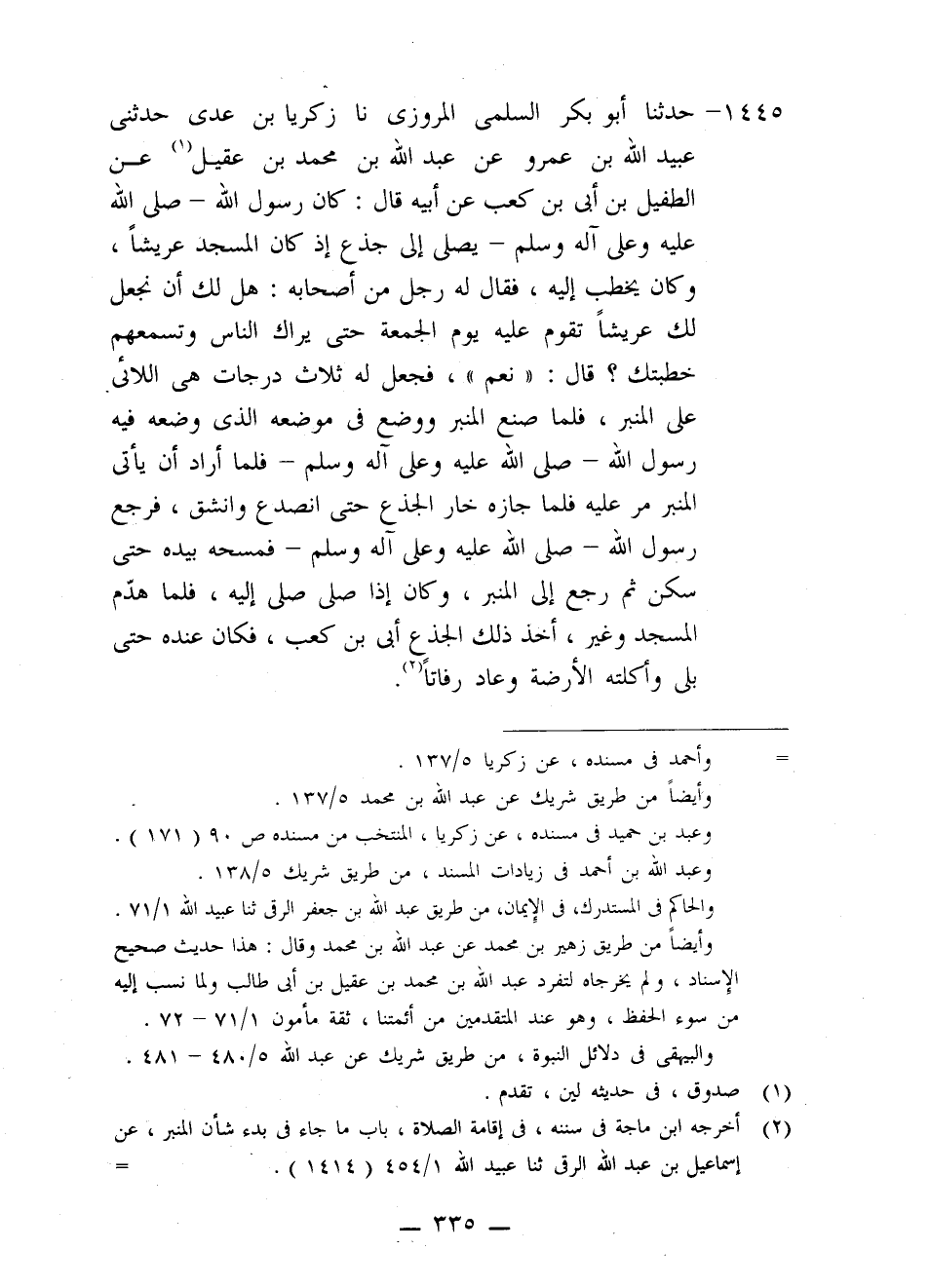 1445 - حَدَّثَنَا أَبُو بَكْرٍ السُّلَمِيُّ الْمَرْوَزِيُّ، نا زَكَرِيَّا بْنُ عَدِيٍّ، حَدَّثَنِي عُبَيْدُ اللَّهِ بْنُ عَمْرٍو، عَنْ عَبْدِ اللَّهِ بْنِ مُحَمَّدِ بْنِ عَقِيلٍ، عَنِ الطُّفَيْلِ بْنِ أُبَيِّ بْنِ كَعْبٍ، عَنْ أَبِيهِ، قَالَ: كَانَ رَسُولُ اللَّهِ صَلَّى اللَّهُ عَلَيْهِ وَعَلَى آلِهِ وَسَلَّمَ يُصَلَّى إِلَى جِذْعٍ إِذْ كَانَ الْمَسْجِدُ عَرِيشًا، وَكَانَ يَخْطُبُ إِلَيْهِ، فَقَالَ لَهُ رَجُلٌ مِنْ أَصْحَابِهِ: هَلْ لَكَ أَنْ §نَجْعَلَ لَكَ عَرِيشًا تَقُومُ عَلَيْهِ يَوْمَ الْجُمُعَةِ حَتَّى يَرَاكَ النَّاسُ وَتُسْمِعَهُمْ خُطْبَتَكَ؟ قَالَ: «نَعَمْ» ، فَجَعَلَ لَهُ ثَلَاثَ دَرَجَاتٍ هِيَ اللَّائِي عَلَى الْمِنْبَرِ، فَلَمَّا صُنِعَ الْمِنْبَرُ وَوُضِعَ فِي مَوْضِعِهِ الَّذِي وَضَعَهُ فِيهِ رَسُولُ اللَّهِ صَلَّى اللَّهُ عَلَيْهِ وَعَلَى آلِهِ وَسَلَّمَ فَلَمَّا أَرَادَ أَنْ يَأْتِيَ الْمِنْبَرَ مَرَّ عَلَيْهِ فَلَمَّا جَازَهُ خَارَ الْجِذْعُ حَتَّى انْصَدَعَ وَانْشَقَّ، فَرَجَعَ رَسُولُ اللَّهِ صَلَّى اللَّهُ عَلَيْهِ وَعَلَى آلِهِ وَسَلَّمَ فَمَسَحَهُ بِيَدِهِ حَتَّى سَكَنَ ثُمَّ رَجَعَ إِلَى الْمِنْبَرِ، وَكَانَ إِذَا صَلَّى صَلَّى عَلَيْهِ، فَلَمَّا هُدِمَ الْمَسْجِدُ وَغُيِّرَ، أَخَذَ ذَلِكَ الْجِذْعَ أُبَيُّ بْنُ كَعْبٍ، فَكَانَ عِنْدَهُ حَتَّى بَلِيَ وَأَكَلَتْهُ الْأَرَضَةُ وَعَادَ رُفَاتًا