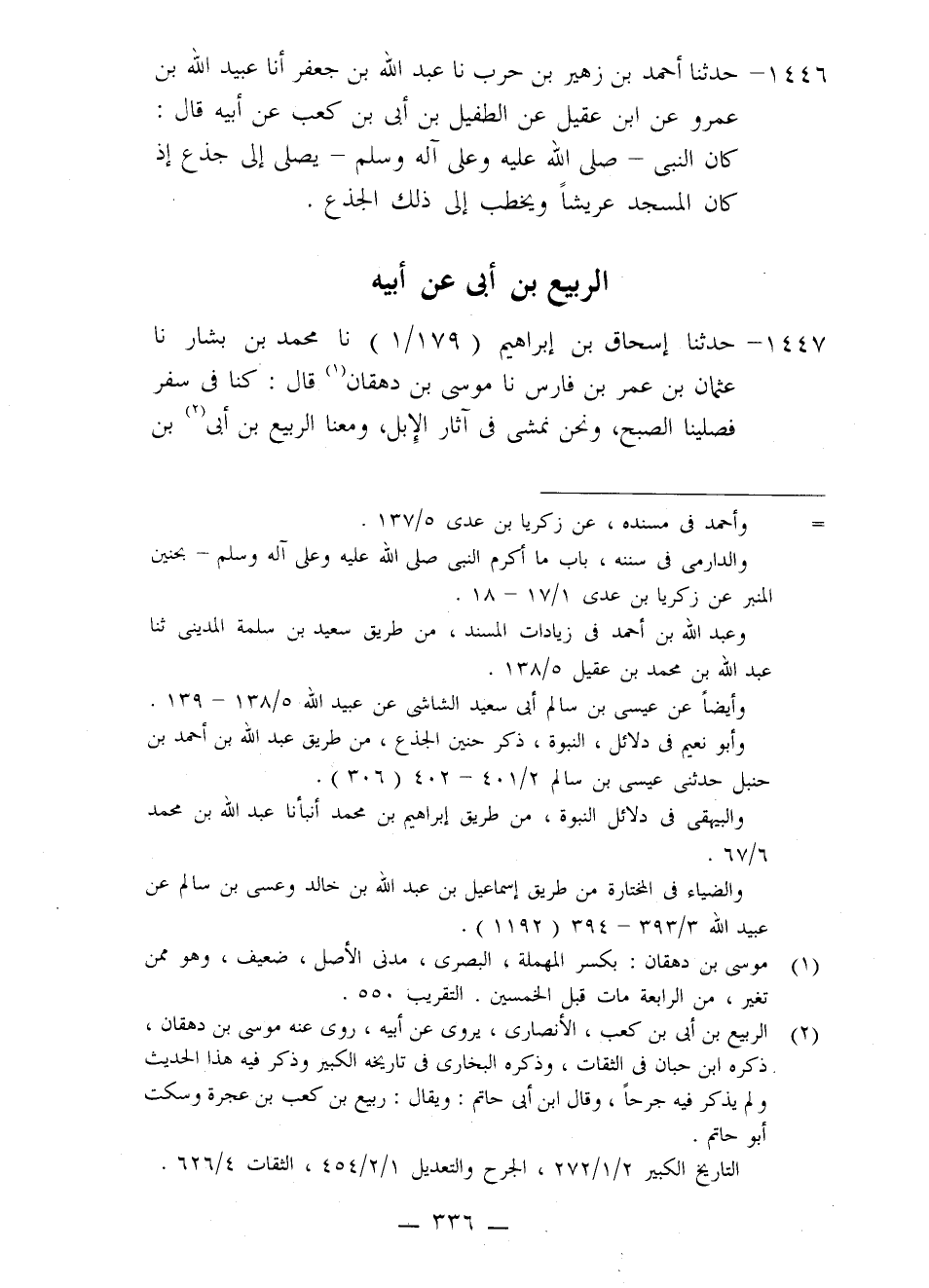1446 - حَدَّثَنَا أَحْمَدُ بْنُ زُهَيْرِ بْنِ حَرْبٍ، نا عَبْدُ اللَّهِ بْنِ جَعْفَرٍ، أَنَا عُبَيْدُ اللَّهِ بْنُ عَمْرٍو، عَنِ ابْنِ عَقِيلٍ، عَنْ الطُفَيْلِ بْنِ أُبَيِّ بْنِ كَعْبٍ، عَنْ أَبِيهِ، قَالَ: كَانَ النَّبِيُّ صَلَّى اللَّهُ عَلَيْهِ وَعَلَى آلِهِ وَسَلَّمَ §يُصَلِّي إِلَى جِذْعٍ إِذْ كَانَ الْمَسْجِدُ عَرِيشًا وَيَخْطُبُ إِلَى ذَلِكَ الْجِذْعِ