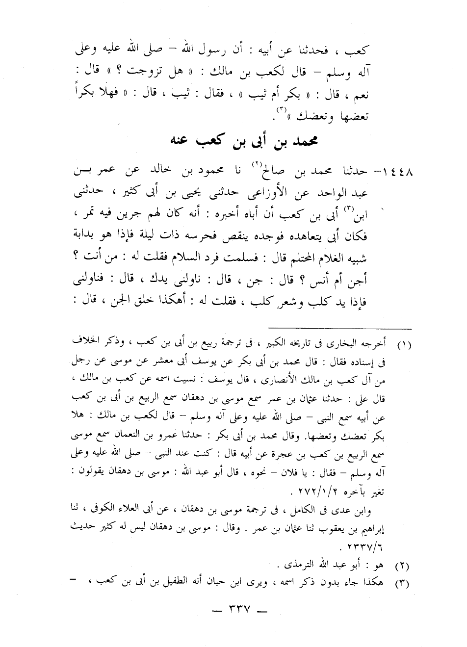 1448 - حَدَّثَنَا مُحَمَّدُ بْنُ صَالِحٍ، نا مَحْمُودُ بْنُ خَالِدٍ، عَنْ عُمَرَ بْنِ عَبْدِ الْوَاحِدِ، عَنِ الْأَوْزَاعِيِّ، حَدَّثَنِي يَحْيَى بْنُ أَبِي كَثِيرٍ، حَدَّثَنِي ابْنُ أُبَيِّ بْنِ كَعْبٍ، أَنَّ أَبَاهُ أَخْبَرَهُ: أَنَّهُ كَانَ لَهُمْ جَرِينٌ فِيهِ تَمْرٌ، فَكَانَ أَبِي يَتَعَاهَدُهُ فَوَجَدَهُ يَنْقُصُ فَحَرَسَهُ ذَاتَ لَيْلَةٍ فَإِذَا هُوَ بِدَابَّةٍ شَبِيهِ الْغُلَامِ الْمُحْتَلِمِ قَالَ: فَسَلَّمْتُ فَرَدَّ السَّلَامَ فَقُلْتُ لَهُ: مَنْ أَنْتَ؟ أَجِنٌّ أَمْ إِنْسٌ؟ قَالَ: جِنٌّ، قَالَ: نَاوِلْنِي يَدَكَ، قَالَ: فَنَاوَلَنِي فَإِذَا يَدُ كَلْبٍ وَشَعْرُ كَلْبٍ، فَقُلْتُ لَهُ: هَكَذَا خَلْقُ الْجِنِّ، قَالَ -[338]-: لَقَدْ عَلِمَتِ الْجِنُّ مَا فِيهِمْ أَشَدُّ مِنًى، قَالَ لَهُ أُبَيُّ: مَا حَمَلَكَ عَلَى مَا صَنَعْتَ؟ قَالَ: بَلَغَنَا أَنَّكَ رَجُلٌ تُحِبُّ الصَّدَقَةَ فَأَحْبَبْنَا أَنْ نُصِيبَ مِنْ طَعَامِكَ، فَقَالَ لَهُ أُبَيٌّ: فَمَا الَّذِي يُجِيرُنَا مِنْكُمْ؟ قَالَ: هَذِهِ الْآيَةُ، آيَةُ الْكُرْسِيِّ، فَتَرَكَ، ثُمَّ غَدَا عَلَى النَّبِيِّ صَلَّى اللَّهُ عَلَيْهِ وَعَلَى آلِهِ وَسَلَّمَ فَحَدَّثَهُ، فَقَالَ النَّبِيُّ صَلَّى اللَّهُ عَلَيْهِ وَعَلَى آلِهِ وَسَلَّمَ: «§صَدَقَ الْخَبِيثُ، صَدَقَ الْخَبِيثُ»