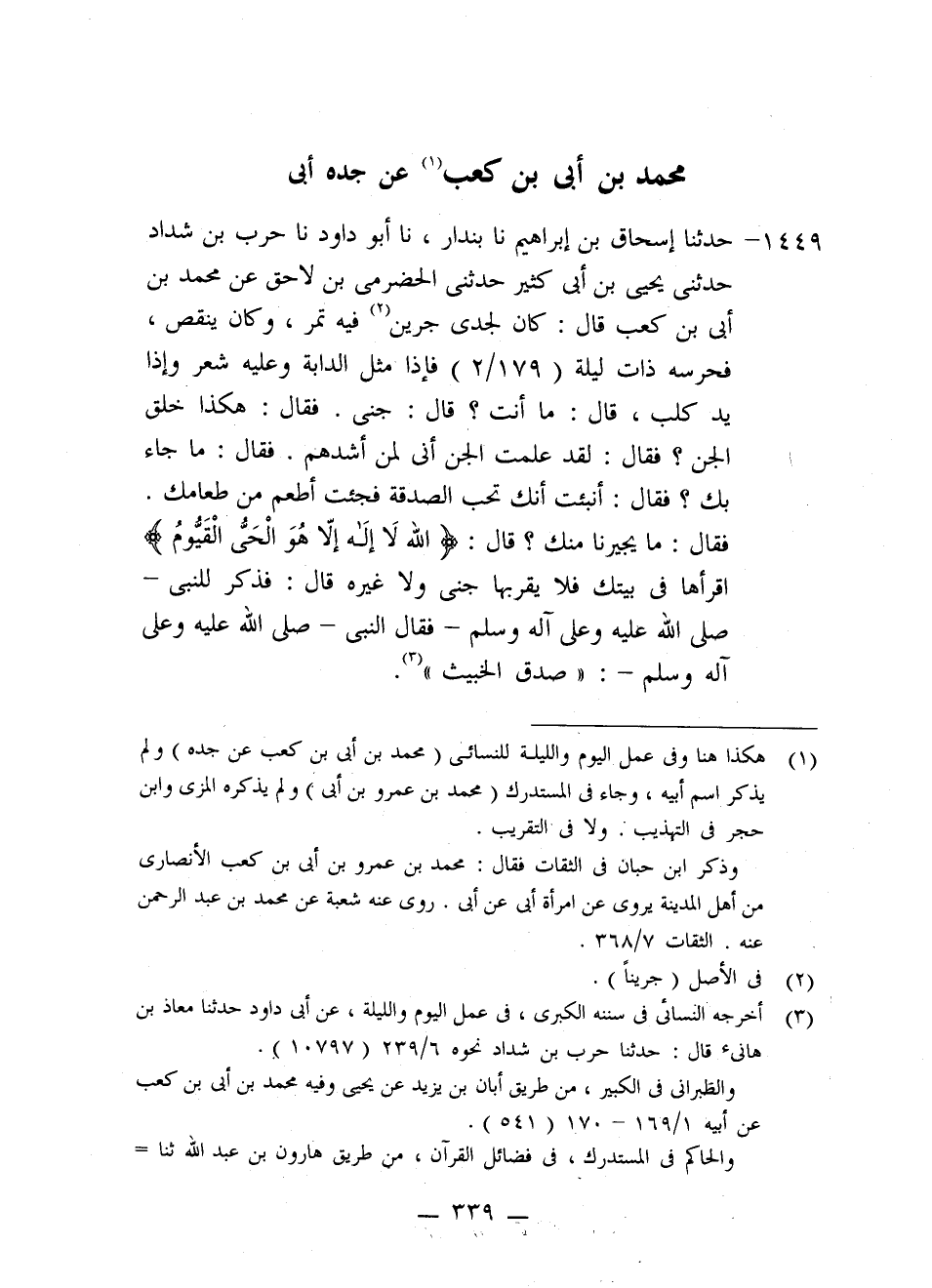 1449 - حَدَّثَنَا إِسْحَاقُ بْنُ إِبْرَاهِيمَ، نا بُنْدَارُ، نا أَبُو دَاوُدَ، نا حَرْبُ بْنُ شَدَّادٍ، حَدَّثَنِي يَحْيَى بْنُ أَبِي كَثِيرٍ، حَدَّثَنِي الْحَضْرَمِيُّ بْنُ لَاحِقٍ، عَنْ مُحَمَّدِ بْنِ أُبَيِّ بْنِ كَعْبٍ، قَالَ: كَانَ لِجَدِّي جَرِينٌ فِيهِ تَمْرٌ، وَكَانَ يَنْقُصُ، فَحَرَسَهُ ذَاتَ لَيْلَةٍ، فَإِذَا مِثْلُ الدَّابَّةِ وَعَلَيْهِ شَعْرٌ وَإِذَا يَدُ كَلْبٍ، قَالَ: مَا أَنْتَ؟ قَالَ: جِنِّيُّ. فَقَالَ: هَكَذَا خَلْقُ الْجِنِّ؟ فَقَالَ: لَقَدْ عَلِمَتِ الْجِنُّ أَنِّي لَمِنْ أَشَدِّهِمْ. فَقَالَ: مَا جَاءَ بِكَ؟ فَقَالَ: أُنْبِئْتُ أَنَّكَ تُحِبُّ الصَّدَقَةَ فَجِئْتُ أُطْعَمُ مِنْ طَعَامَكَ. فَقَالَ: مَا يُجِيرُنَا مِنْكَ؟ قَالَ: {§اللَّهُ لَا إِلَهَ إِلَّا هُوَ الْحَيُّ الْقَيُّومُ} [البقرة: 255] اقْرَأْهَا فِي بَيْتِكَ فَلَا يَقْرَبُهَا جِنِّيٌّ وَلَا غَيْرُهُ، قَالَ: فَذَكَرَ لِلنَّبِيِّ صَلَّى اللَّهُ عَلَيْهِ وَعَلَى آلِهِ وَسَلَّمَ فَقَالَ النَّبِيُّ صَلَّى اللَّهُ عَلَيْهِ وَعَلَى آلِهِ وَسَلَّمَ: «صَدَقَ الْخَبِيثُ»