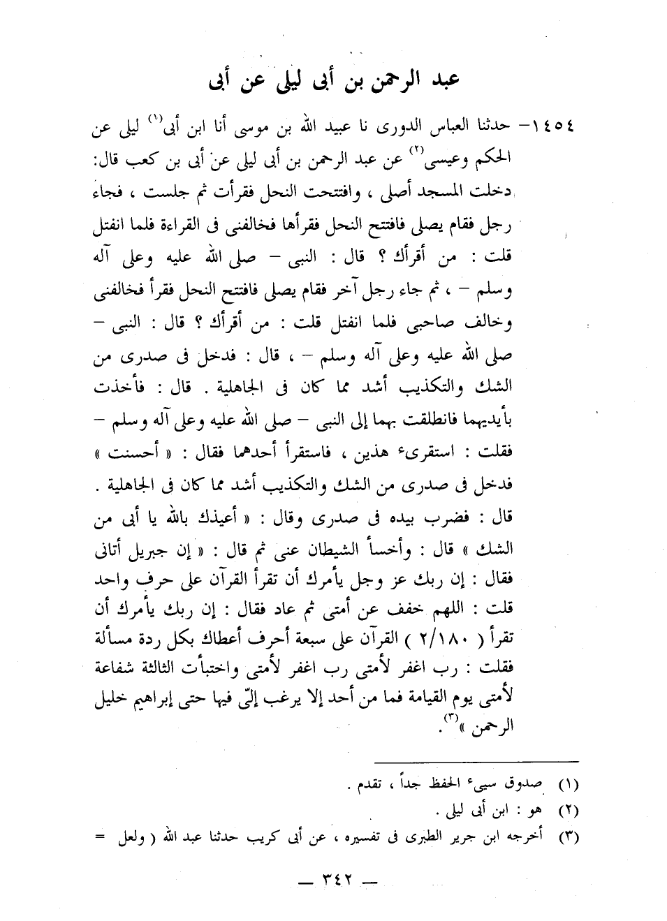 1454 - حَدَّثَنَا الْعَبَّاسُ الدُّورِيُّ، نا عُبَيْدُ اللَّهِ بْنِ مُوسَى، أَنَا ابْنُ أَبِي لَيْلَى، عَنِ الْحَكَمِ، وَعِيسَى، عَنْ عَبْدِ الرَّحْمَنِ بْنِ أَبِي لَيْلَى، عَنْ أُبَيِّ بْنِ كَعْبٍ، قَالَ: دَخَلْتُ الْمَسْجِدَ أُصَلِّي، وَافْتَتَحْتُ النَّحْلَ فَقَرَأْتُ ثُمَّ جَلَسْتُ، فَجَاءَ رَجُلٌ فَقَامَ يُصَلِّي فَافْتَتَحَ النَّحْلَ فَقَرَأَهَا فَخَالَفَنِي فِي الْقِرَاءَةِ فَلَمَّا انْفَتَلَ قُلْتُ: مَنْ أَقْرَأَكَ: قَالَ: النَّبِيُّ صَلَّى اللَّهُ عَلَيْهِ وَعَلَى آلِهِ وَسَلَّمَ، ثُم جَاءَ رَجُلٌ آخِرُ فَقَامَ يُصَلِّي فَافْتَتَحَ النَّحْلَ فَقَرَأَ فَخَالَفَنِي وَخَالَفَ صَاحِبِي، فَلَمَّا انْفَتَلَ قُلْتُ: مَنْ أَقْرَأَكَ؟ قَالَ: النَّبِيُّ صَلَّى اللَّهُ عَلَيْهِ وَعَلَى آلِهِ وَسَلَّمَ، قَالَ: فَدَخَلَ فِي صَدْرِي مِنَ الشَّكِّ وَالتَّكْذِيبِ أَشَدُّ مِمَّا كَانَ في الْجَاهِلِيَّةِ، قَالَ: فَأَخَذْتُ بِأَيْدِيهِمَاِ فَانْطَلَقْتُ بِهِمَا إِلَى النَّبِي صَلَّى اللَّه عَلَيْه وَعَلَى آلِهِ وَسَلَّمَ فَقُلْتُ: اسْتَقْرِئ هَذَيْنِ، فَاسْتَقْرَأ أَحَدَهُمَا فَقَالَ: «أَحْسَنْتَ» فَدَخَلَ فِي صَدْرِي مِنَ الشَّكِّ وَالتَّكْذِيبِ أَشَدَّ مِمَّا كَانَ فِي الْجَاهِلِيَّةِ. قَالَ فَضَرَبَ بِيَدِهِ فِي صَدْرِي وَقَالَ: «أُعِيْذُكَ بِاللَّهِ يَا أُبَيُّ مِنَ الشَّكِّ» قَالَ: وأَخْسَأُ الشَّيْطَانَ عَنِّي ثُمَّ قَالَ: " إِنَّ §جِبْرِيلَ أَتَانِيَ فَقَالَ: إِنَّ رَبَّكَ عَزَّ وَجَلَّ يَأْمُرُكَ أَنْ تَقْرَأَ الْقُرْآنَ عَلَى حَرْفٍ وَاحِدٍ قُلْتُ: اللَّهُمَّ خَفَّفْ عَنْ أُمَّتِي ثُمَّ عَادَ فَقَالَ: إِنَّ رَبَّكَ يَأْمُرُكَ أَنْ تَقْرَأَ الْقُرْآنَ عَلَى سَبْعَةِ أَحْرُفٍ أَعْطَاكَ بِكُلِّ رَدَّةٍ مَسْأَلَةً فَقُلْتُ: رَبِّ اغْفِرْ لِأُمَّتِي رَبِّ اغْفِرْ لِأُمَّتِي وَاخْتَبَأْتُ الثَّالِثَةَ شَفَاعَةً لِأُمَّتِي يَوْمَ الْقِيَامَةِ فَمَا مِنْ أَحَدٍ إِلَّا يَرْغَبُ إِلَي فِيهَا حَتَّى إِبْرَاهِيمُ خَلِيلُ الرَّحْمَنِ "