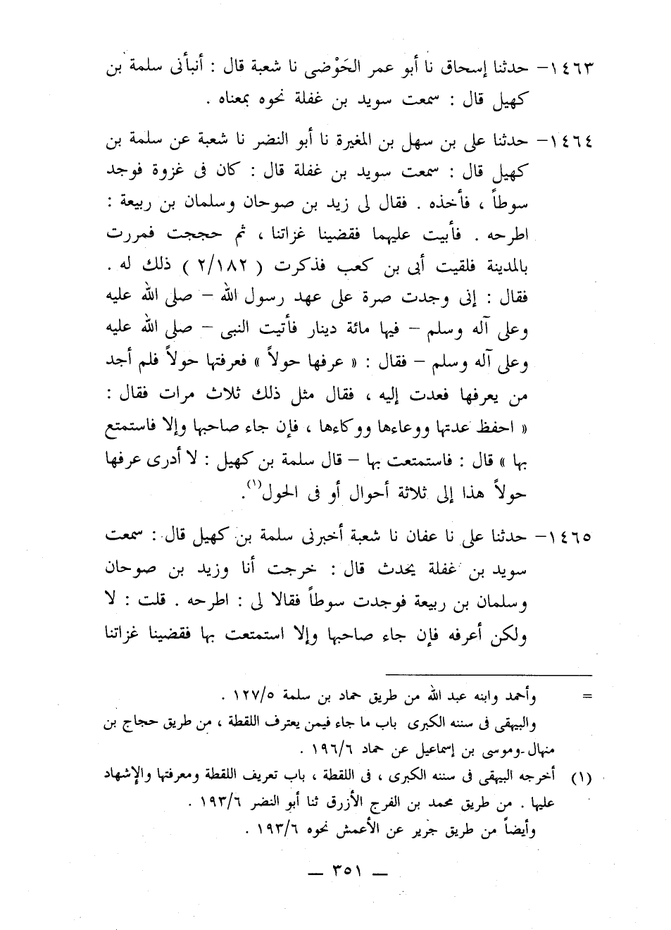 1464 - حَدَّثَنَا عَلِيُّ بْنُ سَهْلِ بْنِ الْمُغِيرَةِ، نا أَبُو النَّضْرِ، نا شُعْبَةُ، عَنْ سَلَمَةَ بْنِ كُهَيْلٍ، قَالَ: سَمِعْتُ سُوَيْدَ بْنَ غَفَلَةَ، قَالَ: كَانَ فِي غَزْوَةٍ فَوَجَدَ سَوْطًا، فَأَخَذَهُ. فَقَالَ لِي زَيْدُ بْنُ صُوحَانَ وَسَلْمَانُ بْنُ رَبِيعَةَ: اطْرَحْهُ. فَأَبَيْتُ عَلَيْهِمَا فَقَضَيْنَا غَزَاتَنَا، ثُمَّ حَجَجْتُ فَمَرَرْتُ بِالْمَدِينَةِ فَلَقِيتُ أُبَيَّ بْنَ كَعْبٍ فَذَكَرْتُ ذَلِكَ لَهُ. فَقَالَ: إِنِّي وَجَدْتُ صُرَّةً عَلَى عَهْدِ رَسُولِ اللَّهِ صَلَّى اللَّهُ عَلَيْهِ وَعَلَى آلِهِ وَسَلَّمَ فِيهَا مِائَةُ دِينَارٍ فَأَتَيْتُ النَّبِيَّ صَلَّى اللَّهُ عَلَيْهِ وَعَلَى آلِهِ وَسَلَّمَ فَقَالَ: «§عَرِّفْهَا حَوْلًا» , فَعَرَّفْتُهَا حَوْلًا فَلَمْ أَجِدْ مَنْ يَعْرِفُهَا فَعُدْتُ إِلَيْهِ، فَقَالَ مِثْلَ ذَلِكَ ثَلَاثَ مَرَّاتٍ، فَقَالَ: «احْفَظْ عِدَّتَهَا وَوِعَاءَهَا وَوِكَاءَهَا، فَإِنْ جَاءَ صَاحِبُهَا وَإِلَّا فَاسْتَمْتِعْ بِهَا» قَالَ: فَاسْتَمْتَعْتُ بِهَا. قَالَ سَلَمَةُ بْنُ كُهَيْلٍ: لَا أَدْرِي «عَرِّفْهَا حَوْلًا» هَذَا إِلَى ثَلَاثَةِ أَحْوَالٍ أَوْ فِي الْحَوْلِ.
