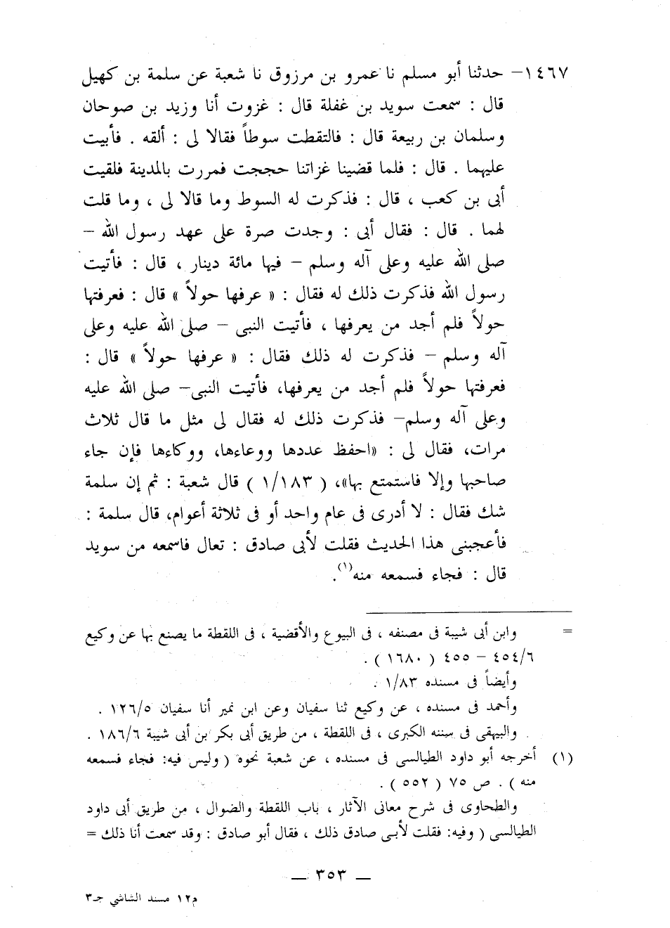 1467 - حَدَّثَنَا أَبُو مُسْلِمٍ، حَدَّثَنَا عَمْرُو بْنُ مَرْزُوقٍ، حَدَّثَنَا شُعْبَةُ، عَنْ سَلَمَةَ بْنِ كُهَيْلٍ، قَالَ: سَمِعْتُ سُوَيْدَ بْنَ غَفَلَةَ، قَالَ: غَزَوْتُ أَنَا وَزَيْدُ بْنُ صُوحَانَ، وَسَلْمَانُ بْنُ رَبِيعَةَ، قَالَ: فَالْتَقَطْتُ سَوْطًا فَقَالَا لِي: أَلْقِهِ. فَأَبَيْتُ عَلَيْهِمَا. قَالَ: فَلَمَّا قَضَيْنَا غَزَاتَنَا حَجَجْتُ فَمَرَرْتُ بِالْمَدِينَةِ فَلَقِيتُ أُبَيَّ بْنَ كَعْبٍ، فَذَكَرْتُ لَهُ السَّوْطَ وَمَا قَالَا لِي، وَمَا قُلْتُ لَهُمَا. قَالَ: فَقَالَ أُبَيٌّ: وَجَدْتُ صُرَّةً عَلَى عَهْدِ رَسُولِ اللَّهِ صَلَّى اللَّهُ عَلَيْهِ وَعَلَى آلِهِ وَسَلَّمَ فِيهَا مِائَةُ دِينَارٍ، قَالَ: فَأَتَيْتُ رَسُولَ اللَّهِ فَذَكَرْتُ ذَلِكَ لَهُ فَقَالَ: «§عَرِّفْهَا حَوْلًا» . قَالَ: فَعَرَّفْتُهَا حَوْلًا فَلَمْ أَجِدْ مَنْ يَعْرِفُهَا، فَأَتَيْتُ النَّبِيَّ صَلَّى اللَّهُ عَلَيْهِ وَعَلَى آلِهِ وَسَلَّمَ فَذَكَرْتُ لَهُ ذَلِكَ فَقَالَ: «عَرِّفْهَا حَوْلًا» . قَالَ: فَعَرَّفْتُهَا حَوْلًا فَلَمْ أَجِدْ مِنْ يَعْرِفُهَا، فَأَتَيْتُ النَّبِيَّ صَلَّى اللَّهُ عَلَيْهِ وَعَلَى آلِهِ وَسَلَّمَ فَذَكَرْتُ ذَلِكَ لَهُ فَقَالَ لِي مِثْلَ مَا قَالَ ثَلَاثَ مَرَّاتٍ، فَقَالَ لِي: «احْفَظْ عَدَدَهَا وَوِعَاءَهَا، وَوِكَاءَهَا، فَإِنْ جَاءَ صَاحِبُهَا وَإِلَّا فَاسْتَمْتِعْ بِهَا» ، قَالَ شُعْبَةُ: ثُمَّ إِنِّ سَلَمَةَ شَكَّ فَقَالَ: لَا أَدْرِي فِي عَامٍ وَاحِدٍ أَوْ فِي ثَلَاثَةِ أَعْوَامٍ، قَالَ سَلَمَةُ: فَأَعْجَبَنِي هَذَا الْحَدِيثُ فَقُلْتُ لِأَبِي صَادِقٍ: تَعَالَ فَاسْمَعْهُ مِنْ سُوَيْدٍ قَالَ: فَجَاءَ فَسَمِعَهُ مِنْهُ