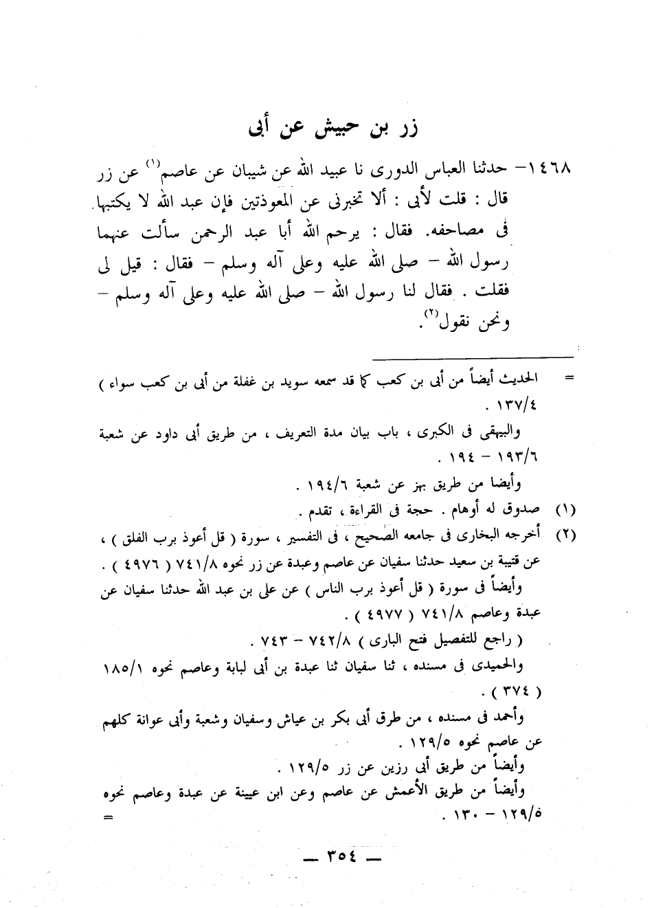 1468 - حَدَّثَنَا الْعَبَّاسُ الدُّورِيُّ، نا عُبَيْدُ اللَّهِ، عَنْ شَيْبَانَ، عَنْ عَاصِمٍ، عَنْ زِرٍّ، قَالَ: قُلْتُ لِأُبَيٍّ: §أَلَا تُخْبِرُنِي عَنِ الْمُعَوِّذَتَيْنِ فَإِنَّ عَبْدَ اللَّهِ لَا يَكْتُبُهَا فِي مَصَاحِفِهِ. فَقَالَ: يَرْحَمُ اللَّهُ أَبَا عَبْدِ الرَّحْمَنِ سَأَلْتُ عَنْهُمَا رَسُولَ اللَّهِ صَلَّى اللَّهُ عَلَيْهِ وَعَلَى آلِهِ وَسَلَّمَ فَقَالَ: «قِيلَ لِي فَقُلْتُ» . فَقَالَ لَنَا رَسُولُ اللَّهِ صَلَّى اللَّهُ عَلَيْهِ وَعَلَى آلِهِ وَسَلَّمَ وَنَحْنُ نَقُولُ
