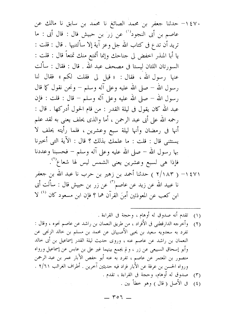 1470 - حَدَّثَنَا جَعْفَرُ بْنُ مُحَمَّدٍ الصَّائِغِ، نا مُحَمَّدُ بْنُ سَابِقٍ، نا مَالِكٌ، عَنْ عَاصِمِ بْنِ أَبِي النَّجُودِ، عَنْ زِرِّ بْنِ حُبَيْشٍ، قَالَ: قَالَ أُبَيٌّ: مَا تُرِيدُ أَنْ تَدَعَ فِي كِتَابِ اللَّهِ جَلَّ وَعَزَّ آيَةً إِلَّا سَأَلْتِنِيهَا. قَالَ: قُلْتُ: يَا أَبَا الْمُنْذِرِ اخْفِضْ لِي جَنَاحَكَ وَإِنَّمَا أَتَمَتَّعُ مِنْكَ تَمَتُّعًا، قَالَ: قُلْتُ: §السُّورَتَانِ اللَّتَانِ لَيْسَتَا فِي مُصْحَفِ عَبْدِ اللَّهِ. قَالَ: فَقَالَ: سَأَلْتُ عَنْهَا رَسُولَ اللَّهِ، فَقَالَ: «قِيلَ لِي فَقُلْتُ لَكُمْ» . فَقَالَ لَنَا رَسُولُ اللَّهِ صَلَّى اللَّهُ عَلَيْهِ وَعَلَى آلِهِ وَسَلَّمَ وَنَحْنُ نَقُولُ كَمَا قَالَ رَسُولُ اللَّهِ صَلَّى اللَّهُ عَلَيْهِ وَعَلَى آلِهِ وَسَلَّمَ قَالَ: قُلْتُ: فَإِنَّ عَبْدَ اللَّهِ كَانَ يَقُولُ فِي لَيْلَةِ الْقَدْرِ: مَنْ قَامَ الْحَوْلَ أَدْرَكَهَا. قَالَ: رَحْمَةُ اللَّهِ عَلَى أَبِي عَبْدِ الرَّحْمَنِ، أَمَا وَالَّذِي يُحْلَفُ يَعْنِي بِهِ لَقَدْ عَلِمَ أَنَّهَا فِي رَمَضَانَ وَأَنَّهَا لَيْلَةُ سَبْعٍ وَعِشْرِينَ، فَلَمَّا رَأَيْتُهُ يَحْلِفُ لَا يَسْتَثْنِي، قَالَ: قُلْتُ: مَا عِلْمُكَ بِذَلِكَ؟ قَالَ: الْآيَةُ الَّتِي أَخْبَرَنَا بِهَا رَسُولُ اللَّهِ صَلَّى اللَّهُ عَلَيْهِ وَعَلَى آلِهِ وَسَلَّمَ فَحَسَبْنَا وَعَدَدْنَا فَإِذَا هِيَ لِسَبْعٍ وَعِشْرِينَ يَعْنِي الشَّمْسَ لَيْسَ لَهَا شُعَاعٌ