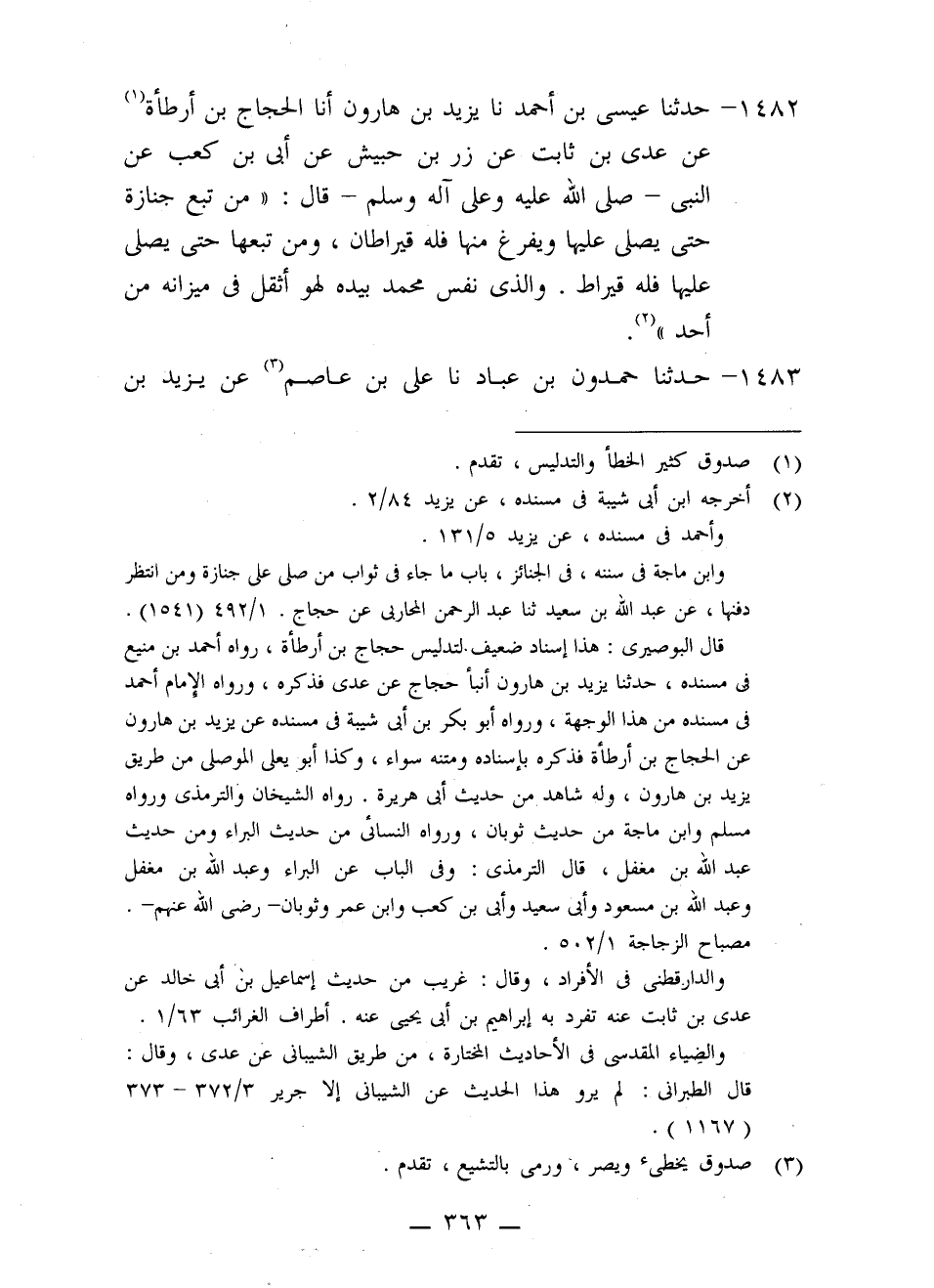 1482 - حَدَّثَنَا عِيسَى بْنُ أَحْمَدَ، نا يَزِيدُ بْنُ هَارُونَ، أَنَا الْحَجَّاجُ بْنُ أَرْطَأَةَ، عَنْ عَدِيِّ بْنِ ثَابِتٍ، عَنْ زِرِّ بْنِ حُبَيْشٍ، عَنْ أُبَيِّ بْنِ كَعْبٍ، عَنِ النَّبِيِّ صَلَّى اللَّهُ عَلَيْهِ وَعَلَى آلِهِ وَسَلَّمَ قَالَ: «§مَنْ تَبِعَ جَنَازَةٍ حَتَّى يُصَلَّى عَلَيْهَا وَيُفْرَغَ مِنْهَا فَلَهُ قِيرَاطَانِ، وَمَنْ تَبِعَهَا حَتَّى يُصَلَّى عَلَيْهَا فَلَهُ قِيرَاطٌ. وَالَّذِي نَفْسُ مُحَمَّدٍ بِيَدِهِ لَهُوَ أَثْقَلُ فِي مِيزَانِهِ مِنْ أُحُدٍ»