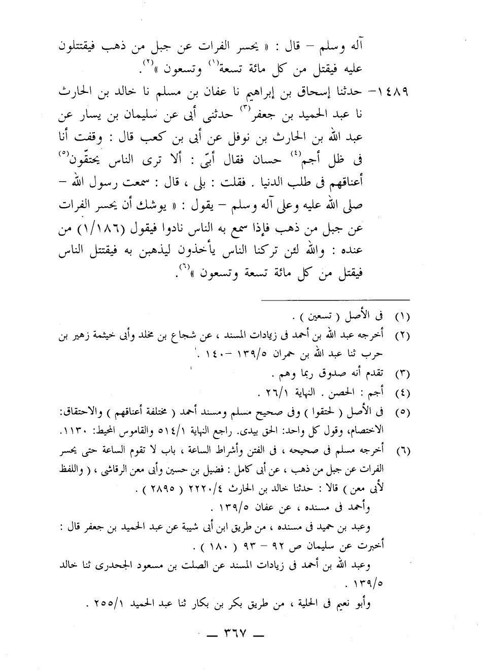 1489 - حَدَّثَنَا إِسْحَاقُ بْنُ إِبْرَاهِيمَ، نا عَفَّانُ بْنُ مُسْلِمٍ، نا خَالِدُ بْنُ الْحَارِثِ، نا عَبْدُ الْحَمِيدِ بْنُ جَعْفَرٍ، حَدَّثَنِي أَبِي، عَنْ سُلَيْمَانَ بْنُ يَسَارٍ، عَنْ عَبْدِ اللَّهِ بْنِ الْحَارِثِ بْنِ نَوْفَلٍ، عَنْ أُبَيِّ بْنِ كَعْبٍ، قَالَ: وَقَفْتُ أَنَا فِي ظِلِّ أُجُمِ حَسَّانَ فَقَالَ أُبَيُّ: أَلَا تَرَى النَّاسَ يَحْتَقُّونَ أَعْنَاقَهُمْ فِي طَلَبِ الدُّنْيَا. فَقُلْتُ: بَلَى، قَالَ: سَمِعْتُ رَسُولَ اللَّهِ صَلَّى اللَّهُ عَلَيْهِ وَعَلَى آلِهِ وَسَلَّمَ يَقُولُ: " §يُوشِكُ أَنْ يَحْسِرُ الْفُرَاتُ عَنْ جَبَلٍ مِنْ ذَهَبٍ فَإِذَا سَمِعَ بِهِ النَّاسُ نَادَوْا فَيَقُولُ، مَنْ عِنْدَهُ: وَاللَّهِ لَئِنْ تَرَكْنَا النَّاسَ يَأْخُذُونَ لَيَذْهَبُنَّ بِهِ فَيَقْتَتِلَ النَّاسُ فَيُقْتَلُ مِنْ كُلِّ مِائَةٍ تِسْعَةٌ وَتِسْعُونَ "