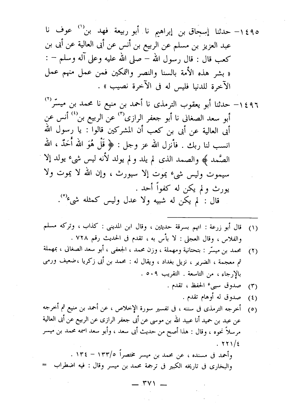 1496 - حَدَّثَنَا أَبُو يَعْقُوبَ التِّرْمِذِيُّ، نا أَحْمَدُ بْنُ مَنِيعٍ، نا مُحَمَّدُ بْنُ مَسِيرٍ أَبُو سَعْدٍ الصَّغَانِيُّ، نا أَبُو جَعْفَرٍ الرَّازِيُّ، عَنِ الرَّبِيعِ بْنِ أَنَسٍ، عَنْ أَبِي الْعَالِيَةَ، عَنْ أُبَيِّ بْنِ كَعْبٍ، أَنَّ الْمُشْرِكِينَ، قَالُوا: يَا رَسُولَ اللَّهِ انْسُبْ لَنَا رَبِّكَ. فَأَنْزَلَ اللَّهُ عَزَّ وَجَلَّ: §قُلْ هُوَ اللَّهُ أَحَدٌ اللَّهُ الصَّمَدُ، وَالصَّمَدُ: الَّذِي لَمْ يَلِدْ وَلَمْ يُولَدْ لِأَنَّهُ لَيْسَ شَيْءٌ يُولَدُ إِلَّا سَيَمُوتُ وَلَيْسَ شَيْءٌ يَمُوتُ إِلَّا سَيُورَثُ، وَإِنَّ اللَّهَ لَا يَمُوتُ وَلَا يُورَثُ {وَلَمْ يَكُنْ لَهُ كُفُوًا أَحَدٌ} [الإخلاص: 4] . قَالَ لَمْ يَكُنْ لَهُ شَبِيهٌ وَلَا عِدْلٌ، وَلَيْسَ كَمِثْلِهِ شَيْءٌ
