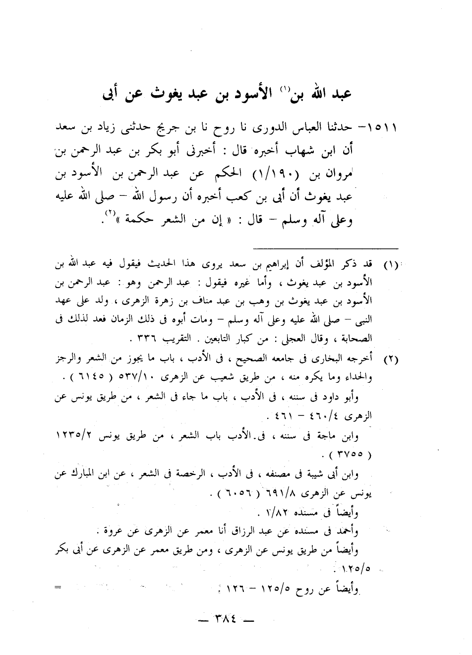 1511 - حَدَّثَنَا الْعَبَّاسُ الدُّورِيُّ، نَا رَوْحٌ، نَا ابْنُ جُرَيْجٍ، حَدَّثَنِي زِيَادُ بْنُ سَعْدٍ، أَنَّ ابْنَ شِهَابٍ أَخْبَرَهُ، قَالَ: أَخْبَرَنِي أَبُو بَكْرِ بْنِ عَبْدِ الرَّحْمَنِ، عَنْ مَرْوَانَ بْنِ الْحَكَمِ، عَنْ عَبْدِ الرَّحْمَنِ بْنِ الْأَسْوَدِ بْنِ عَبْدِ يَغُوثَ، أَنَّ أُبَيَّ بْنَ كَعْبٍ أَخْبَرَهُ , أَنَّ رَسُولَ اللَّهِ صَلَّى اللَّهُ عَلَيْهِ وَعَلَى آلِهِ وَسَلَّمَ قَالَ: «§إِنَّ مِنَ الشَّعْرِ حِكْمَةٌ» -[385]-. قَالَ: سَمِعْتُ يَحْيَى بْنَ مَعِينٍ يَقُولُ: النَّاسُ جَمِيعًا يَقُولُونَ فِي هَذَا الْحَدِيثِ: عَبْدُ الرَّحْمَنِ بْنُ الْأَسْوَدِ بْنِ عَبْدِ يَغُوثَ إلِاَّ إِبْرَاهِيمَ بْنَ سَعْدٍ فَإِنَّهُ يَقُولُ: عَبْدُ اللَّهِ بْنُ الْأَسْوَدِ بْنِ عَبْدِ يَغُوثَ