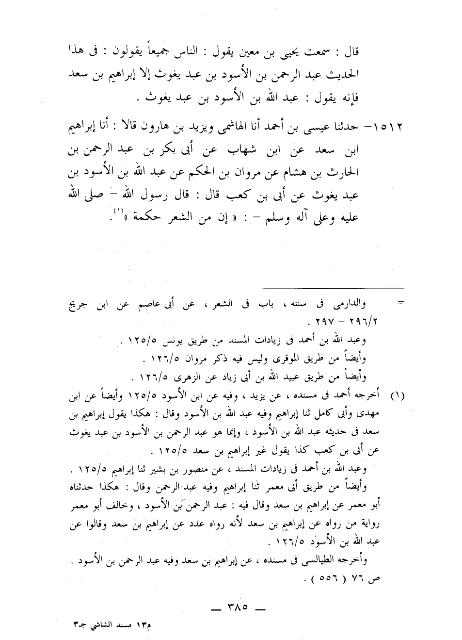 1512 - حَدَّثَنَا عِيسَى بْنُ أَحْمَدَ، أَنَا الْهَاشِمِيُّ، وَيَزِيدُ بْنُ هَارُونَ، قَالَا: أَنَا إِبْرَاهِيمُ بْنُ سَعْدٍ، عَنِ ابْنِ شِهَابٍ، عَنْ أَبِي بَكْرِ بْنِ عَبْدِ الرَّحْمَنِ بْنِ الْحَارِثِ بْنِ هِشَامٍ، عَنْ مَرْوَانَ بْنِ الْحَكَمِ، عَنْ عَبْدِ اللَّهِ بْنِ الْأَسْوَدِ بْنِ عَبْدِ يَغُوثَ، عَنْ أُبَيِّ بْنِ كَعْبٍ، قَالَ: قَالَ رَسُولُ اللَّهِ صَلَّى اللَّهُ عَلَيْهِ وَعَلَى آلِهِ وَسَلَّمَ: «§إِنَّ مِنَ الشَّعْرِ حِكْمَةٌ»