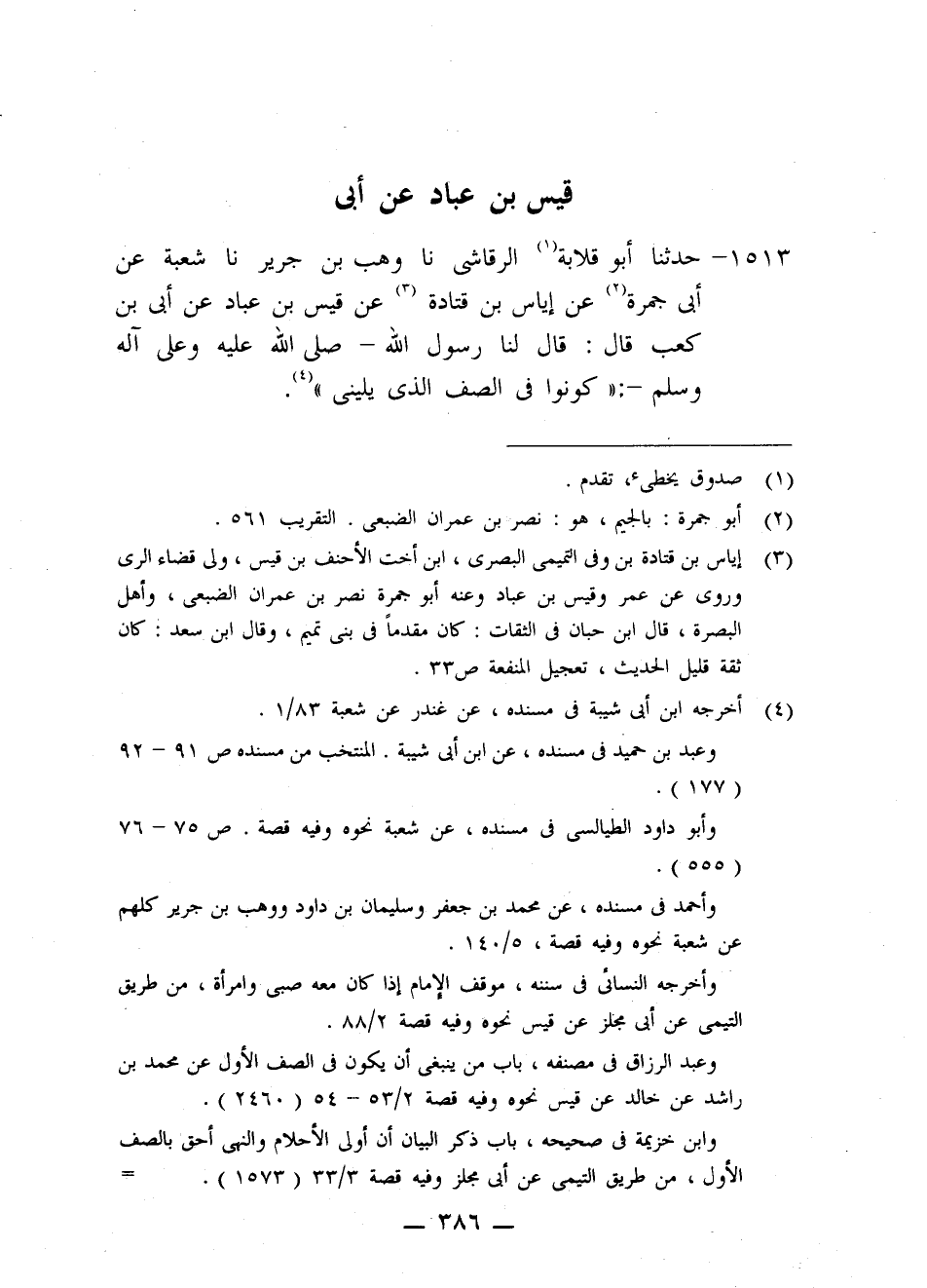 1513 - حَدَّثَنَا أَبُو قِلَابَةَ الرَّقَاشِيَّ، نا وَهْبُ بْنُ جَرِيرٍ، نا شُعْبَةُ، عَنْ أَبِي جَمْرَةَ، عَنْ إِيَاسِ بْنِ قَتَادَةَ، عَنْ قَيْسِ بْنِ عَبَّادٍ، عَنْ أُبَيِّ بْنِ كَعْبٍ، قَالَ: قَالَ لَنَا رَسُولُ اللَّهِ صَلَّى اللَّهُ عَلَيْهِ وَعَلَى آلِهِ وَسَلَّمَ: «§كُونُوا فِي الصَّفِّ الَّذِي يَلِينِي»