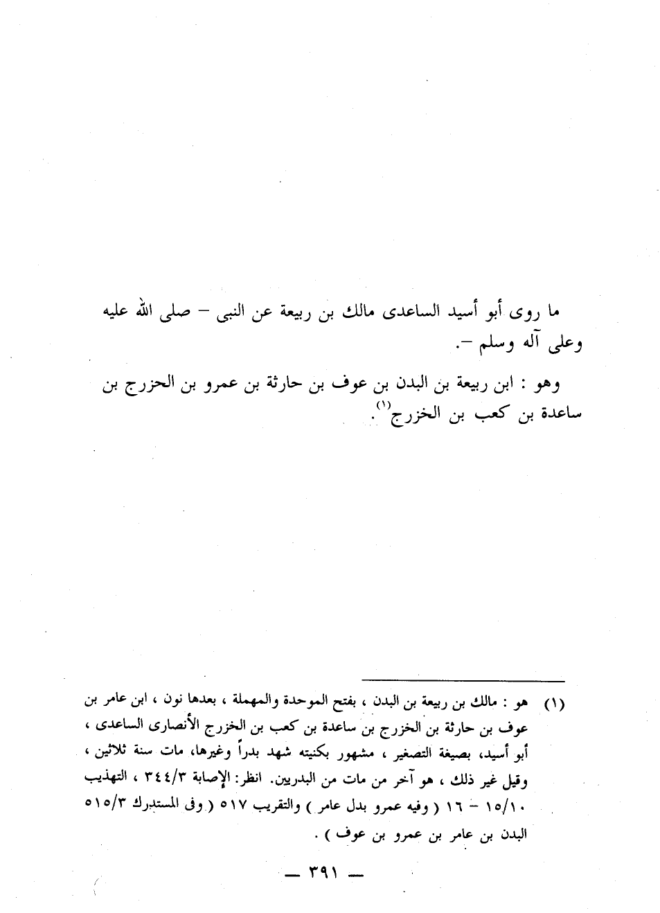 §مَا رَوَى أَبُو أُسَيْدٍ السَّاعِدِيُّ مَالِكُ بْنُ رَبِيعَةَ عَنِ النَّبِيِّ صَلَّى اللَّهُ عَلَيْهِ وَعَلَى آلِهِ وَسَلَّمَ وَهُوَ ابْنُ رَبِيعَةَ بْنِ الْبَدَنِ بْنِ عَوْفِ بْنِ حَارِثَةَ بْنِ عَمْرِو بْنِ الْخَزْرَجِ بْنِ سَاعِدَةَ بْنِ كَعْبِ بْنِ الْخَزْرَجِ